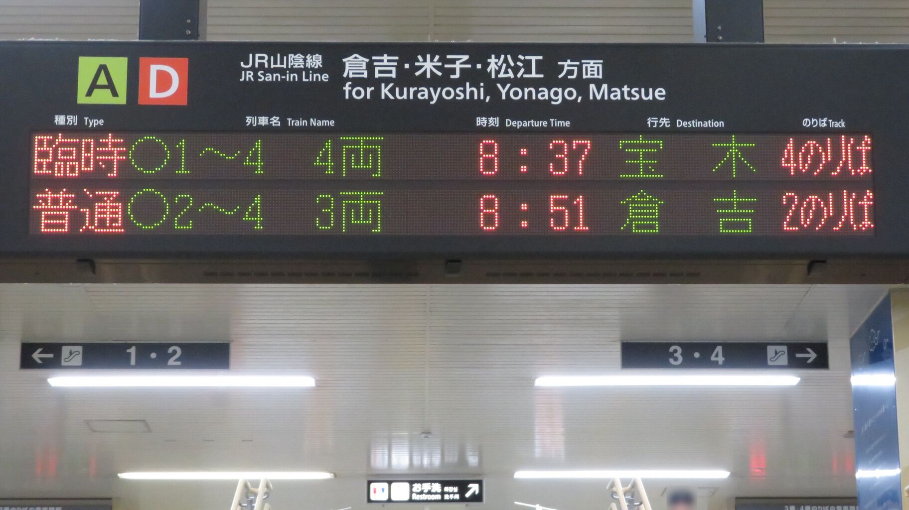 下の段の普通 倉吉行きは、乗車位置が□印になっています。