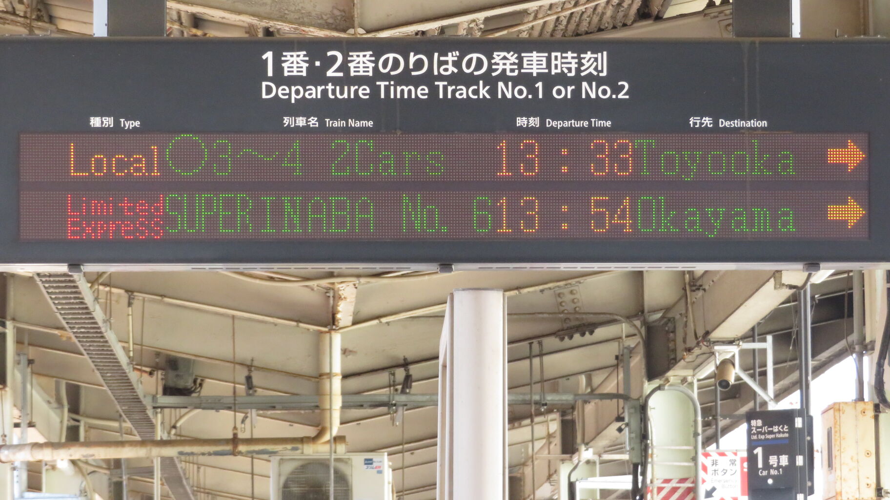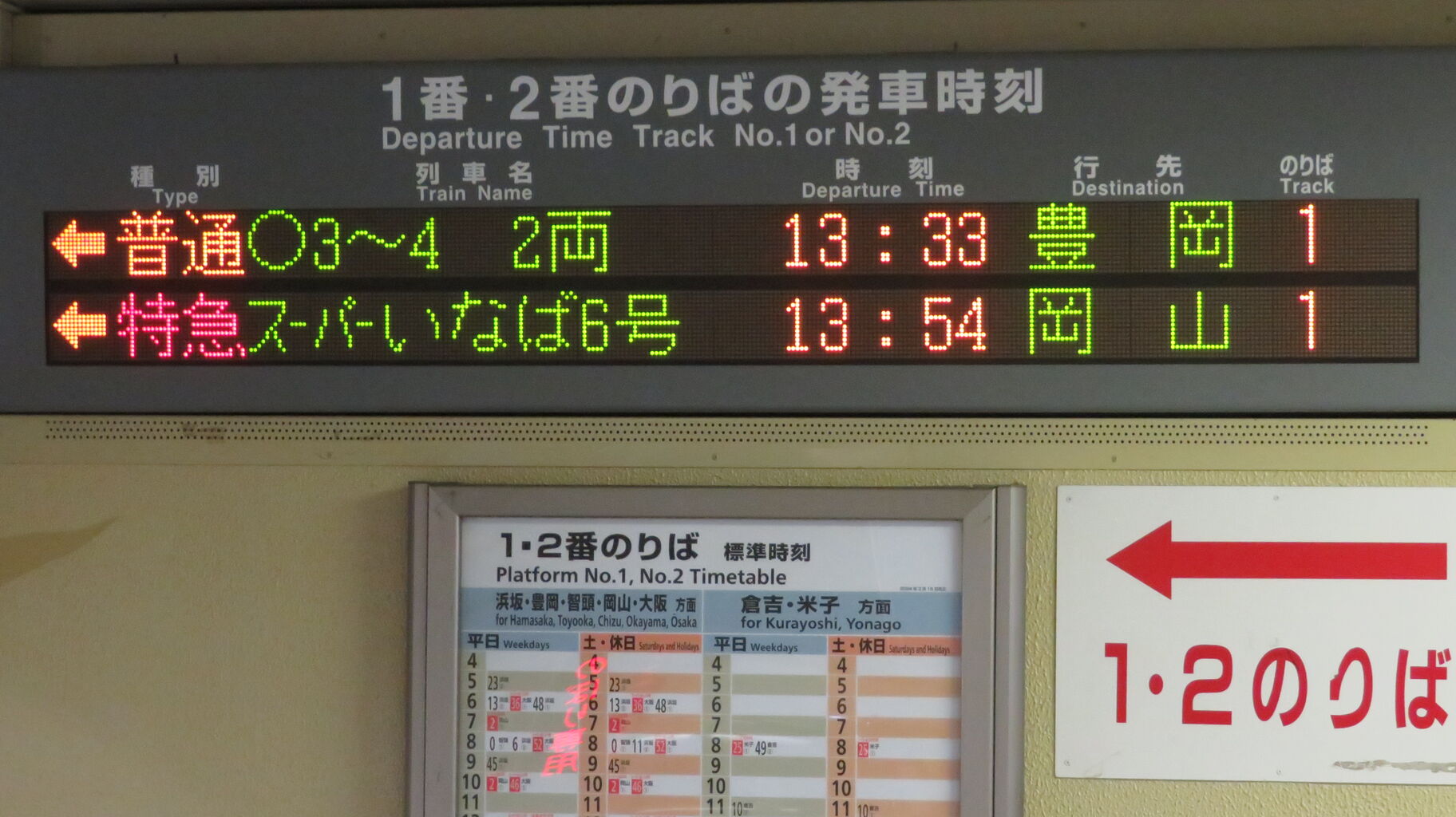 下の段に普通 倉吉行きの表示が出ていますが、冒頭の写真と全然違うのが分かります。