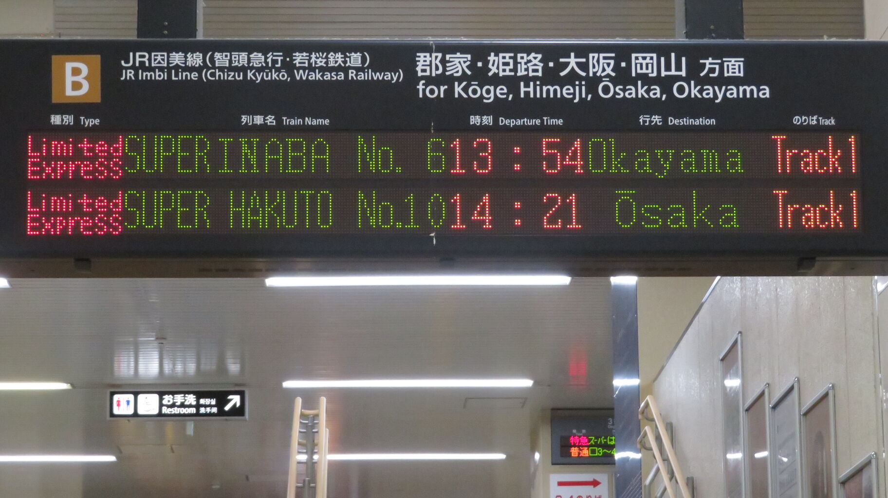 下の段に、特急スーパーはくと 「大阪行き」 が表示されています。