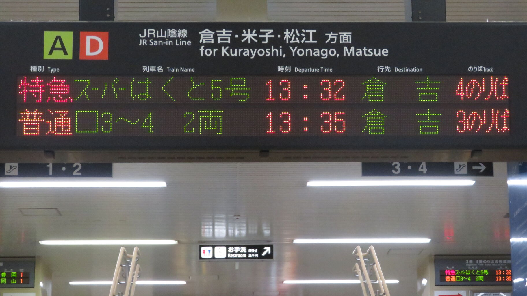 こちらは、山陰線 倉吉・米子方面の発車標です。