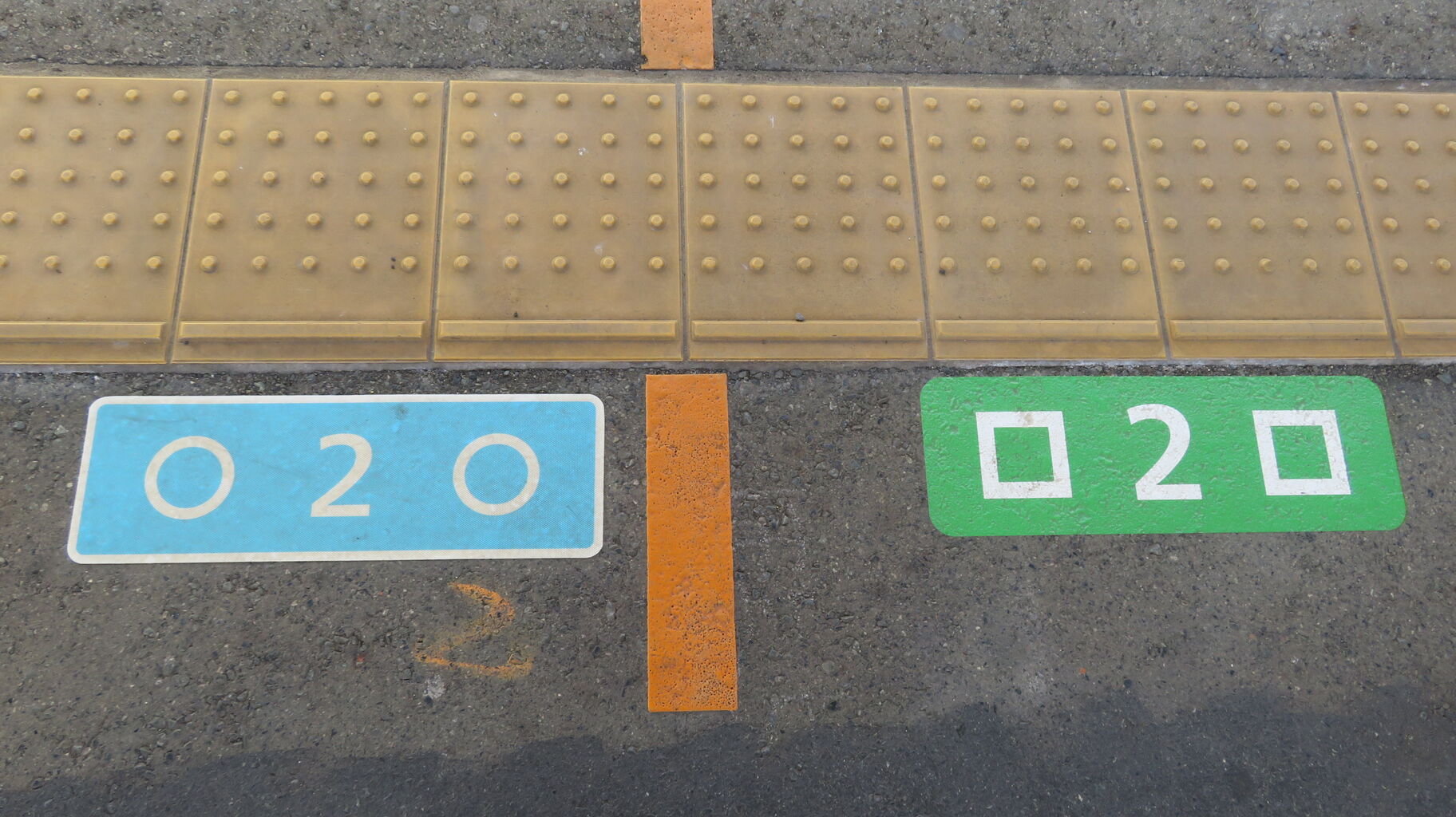 1番のりばの足元にある、□印・○印の乗車位置ステッカーを撮影。
