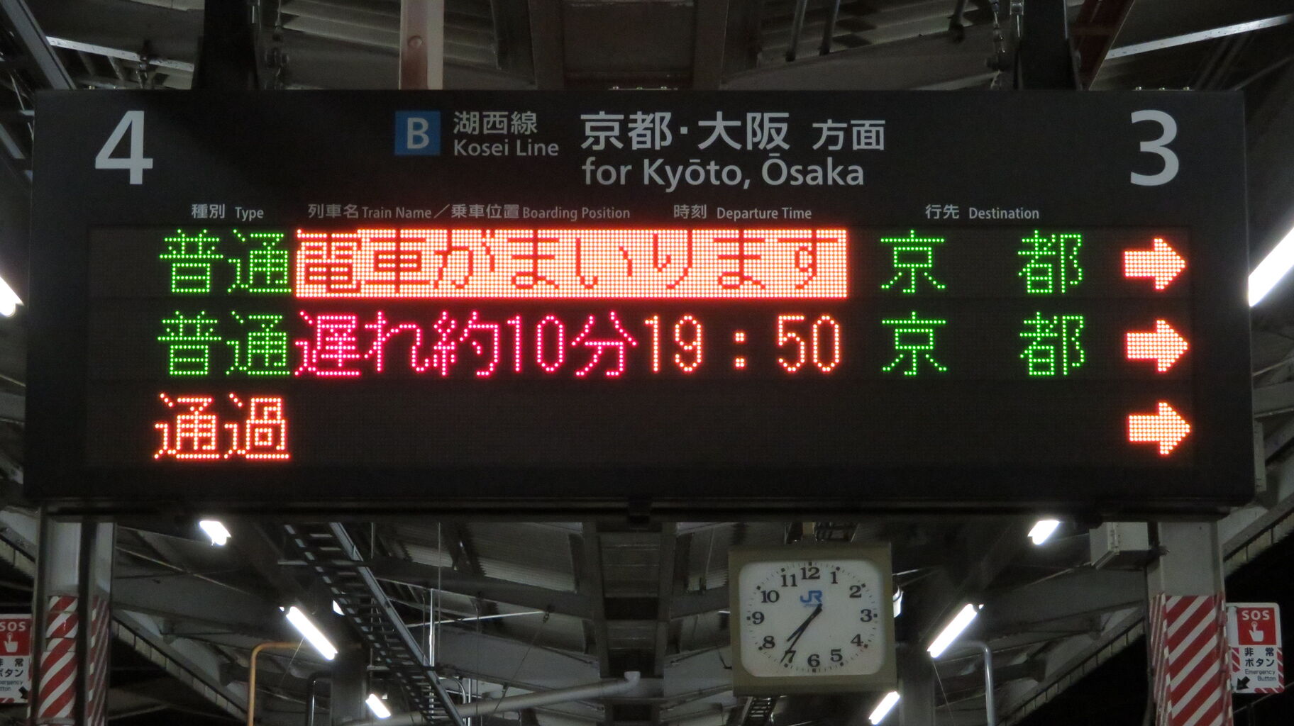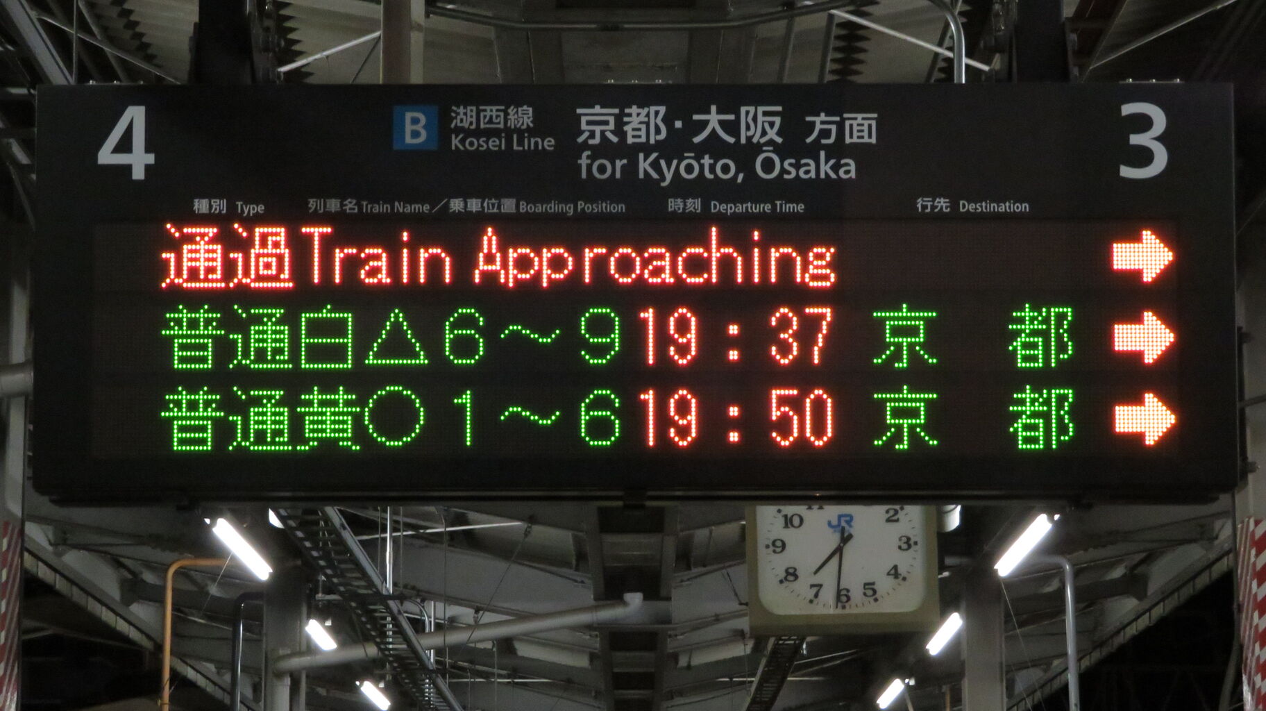 JR西日本 京阪神地区の多くの駅では、電車が接近・通過する時、ホームの発車標に接近表示が出ます。