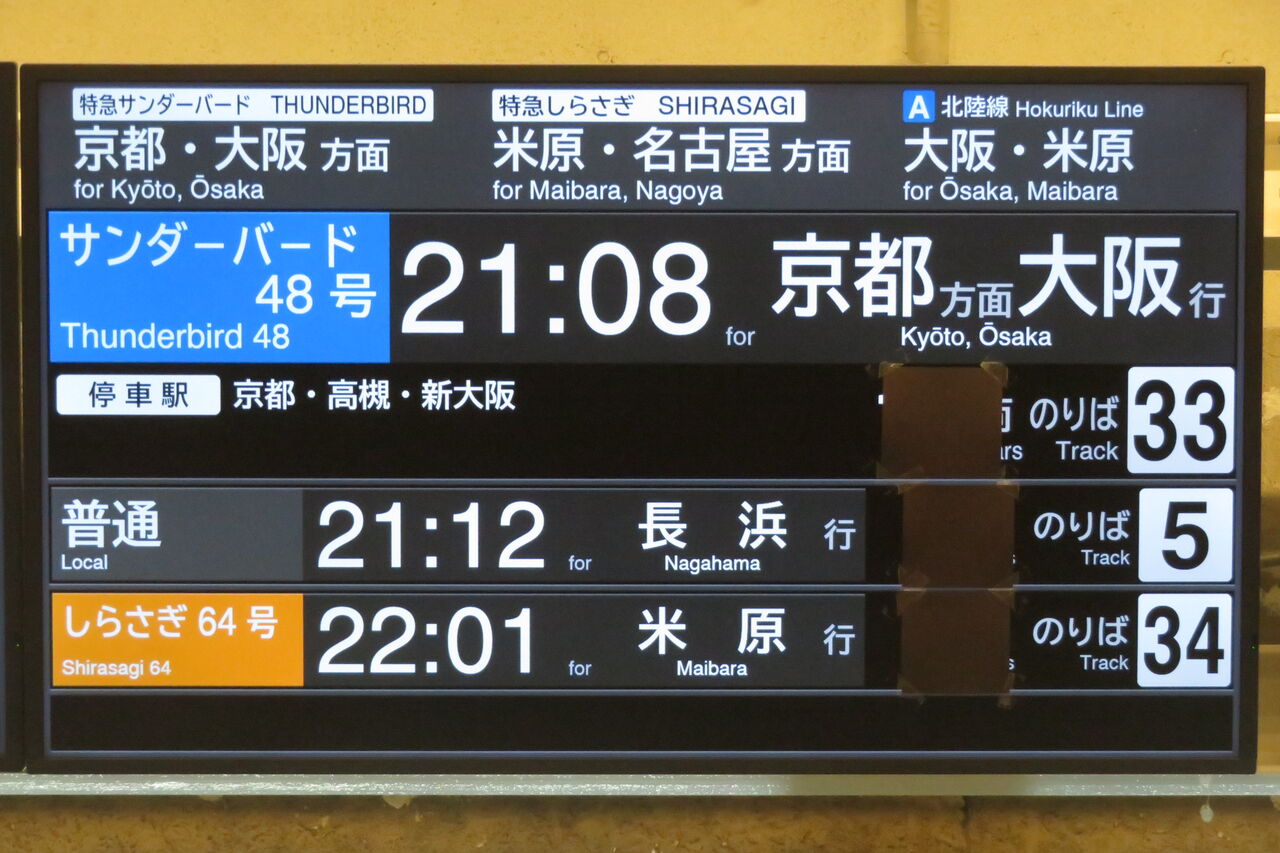 左側に特急サンダーバードとしらさぎ、右側に北陸線と湖西線の普通・快速電車が表示されます。