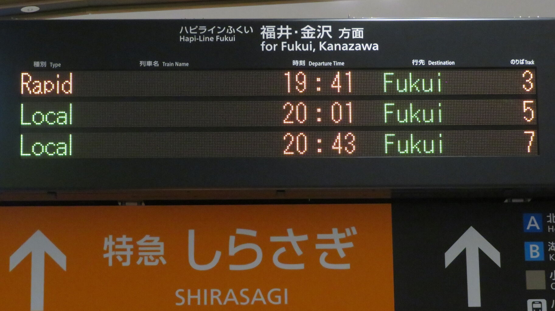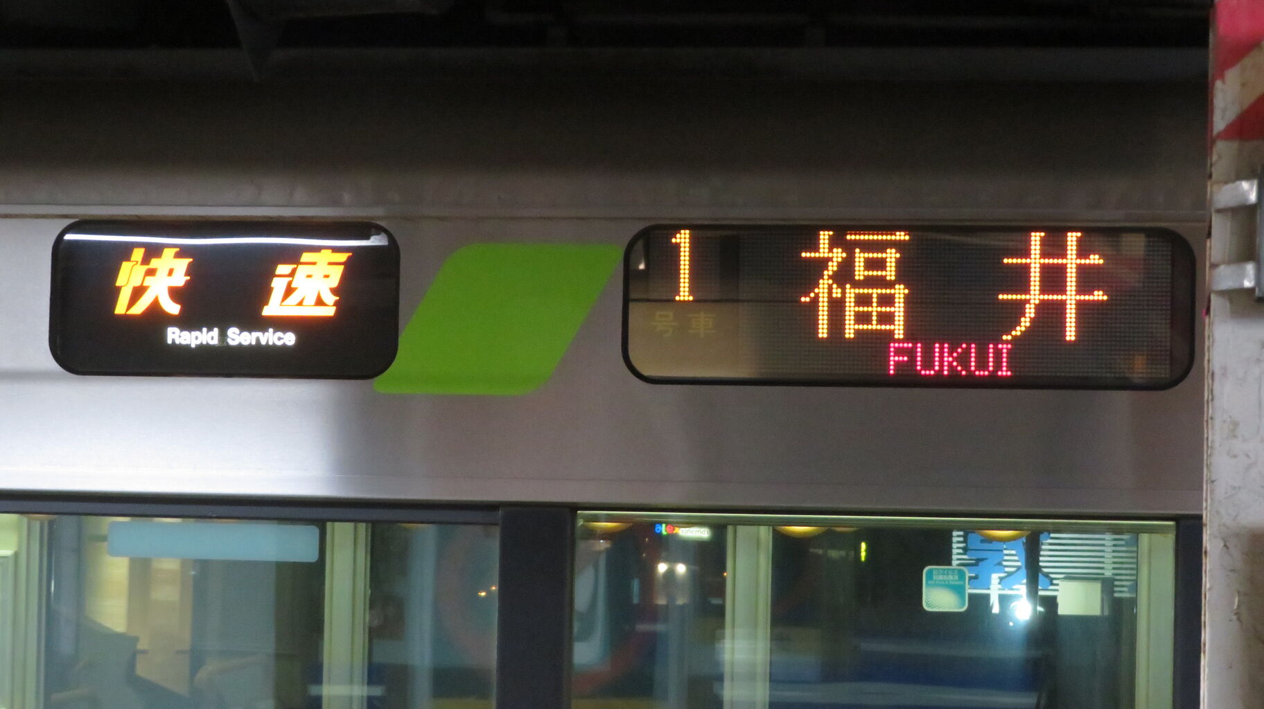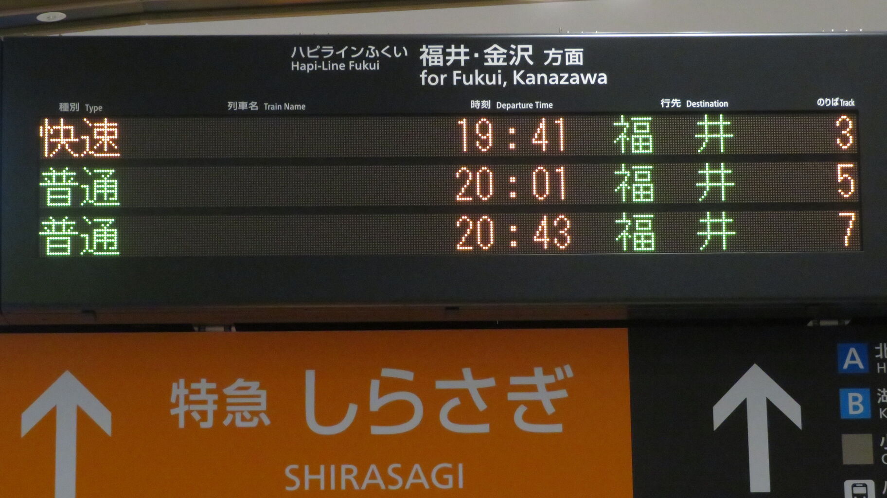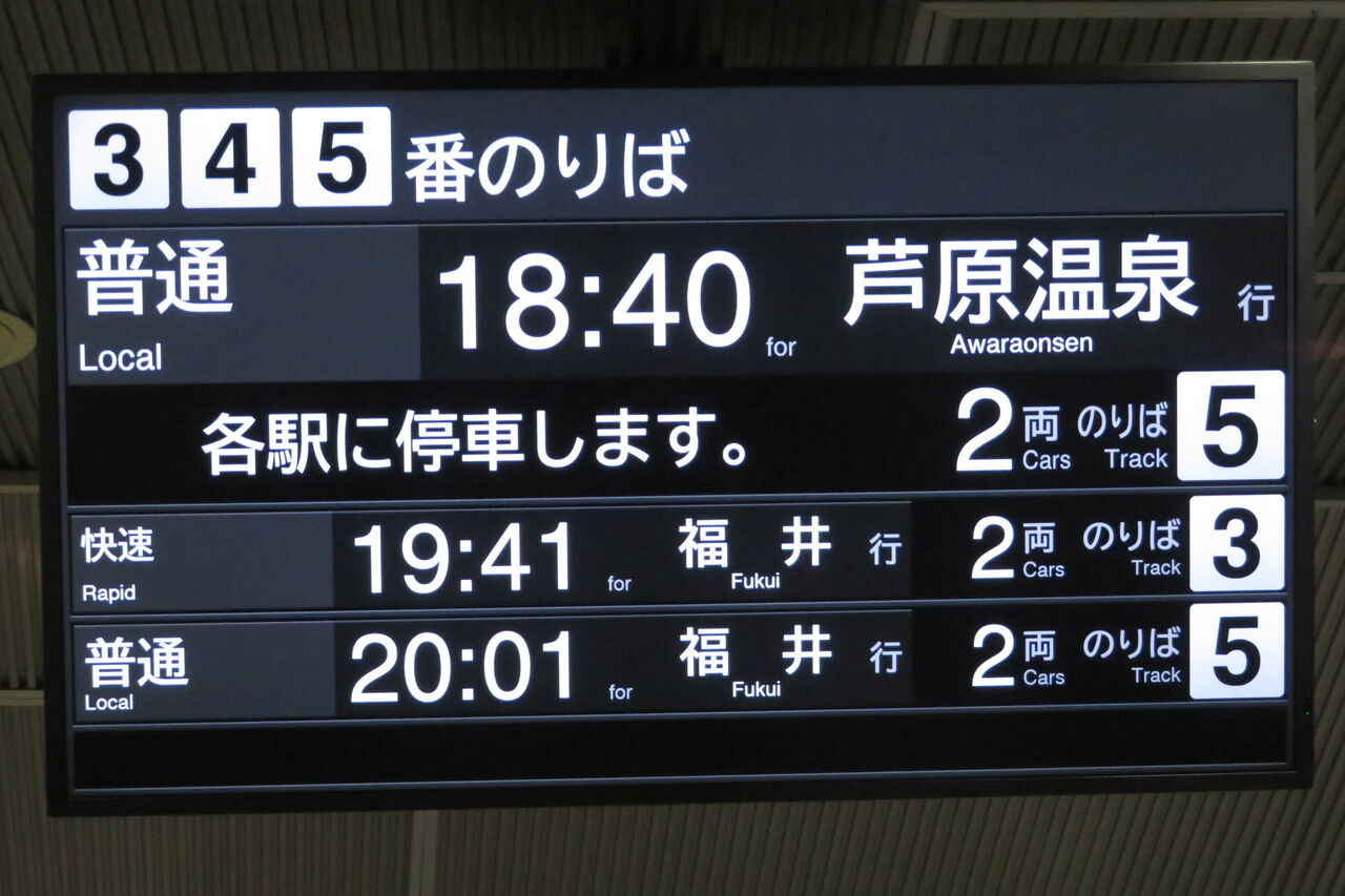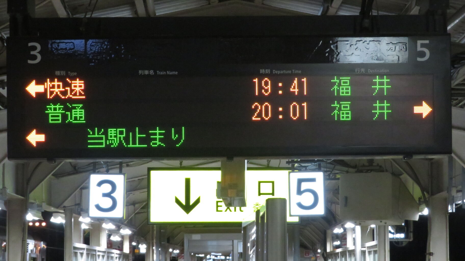 一番下の段に、18時19分発の快速 福井行きが表示されています。