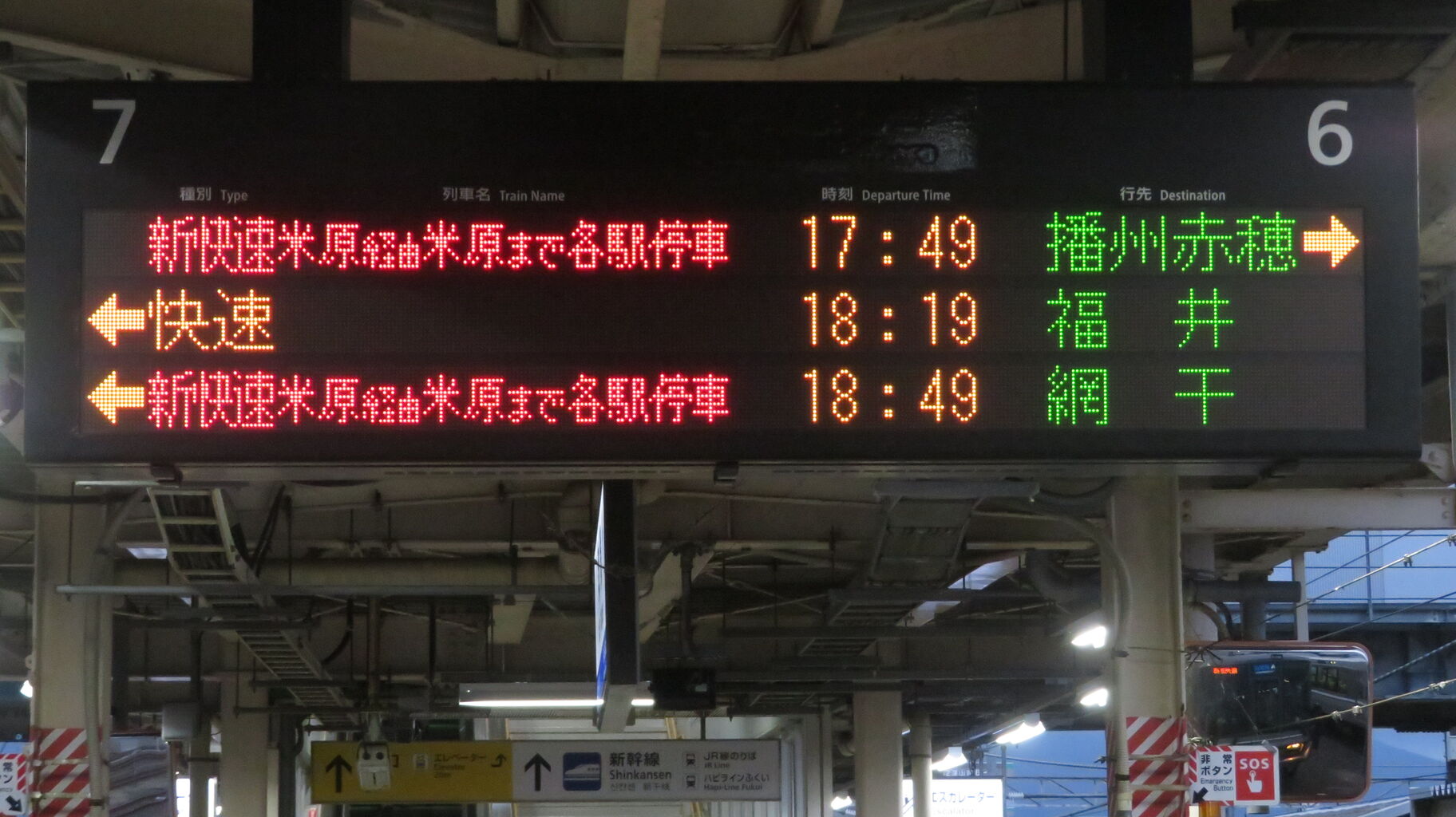 この駅で、1つの発車標に新快速が2本同時に表示されるのは、早朝の時間帯を除いて これまでなかったのではないかと思います。