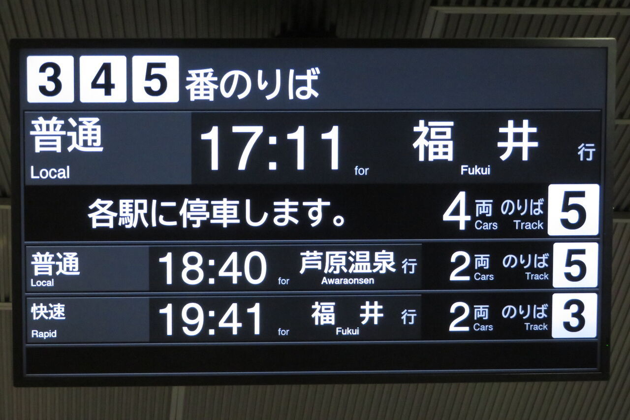 その下には、ダイヤ改正で新設された普通 「鯖江行き」 と、1日に1本しかない普通 「金沢行き」 が表示されています。