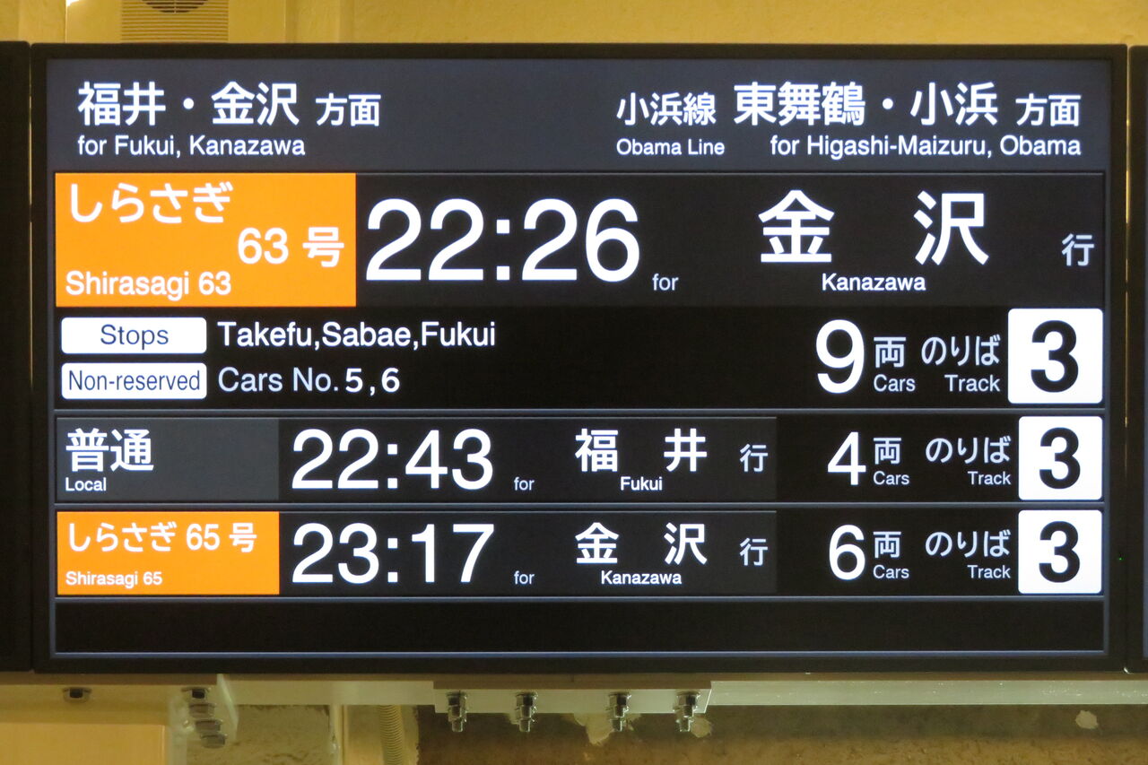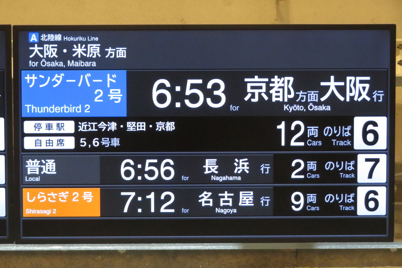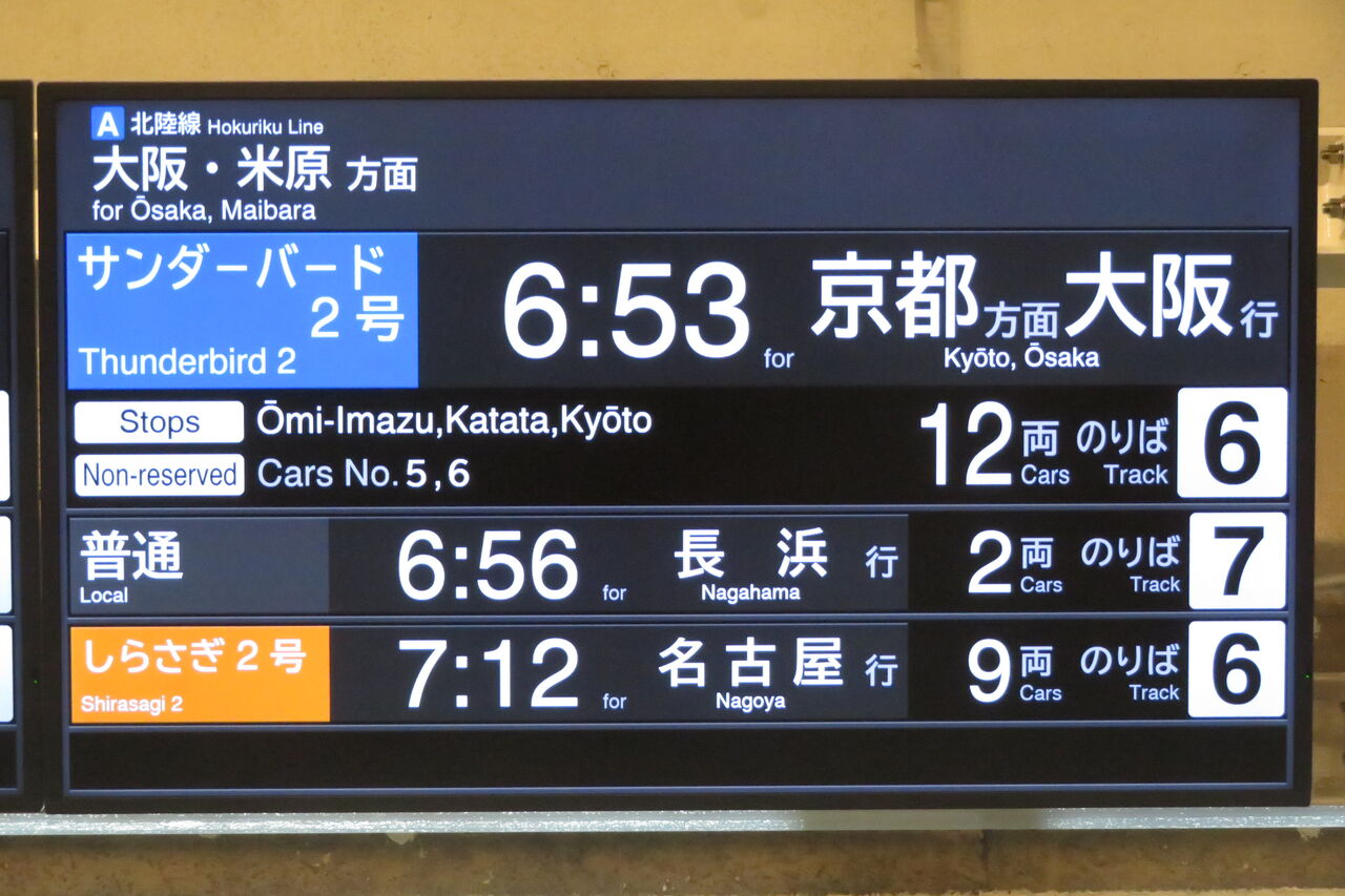 最後は、特急しらさぎ 米原行きと、特急サンダーバード 京都方面大阪行きの表示。