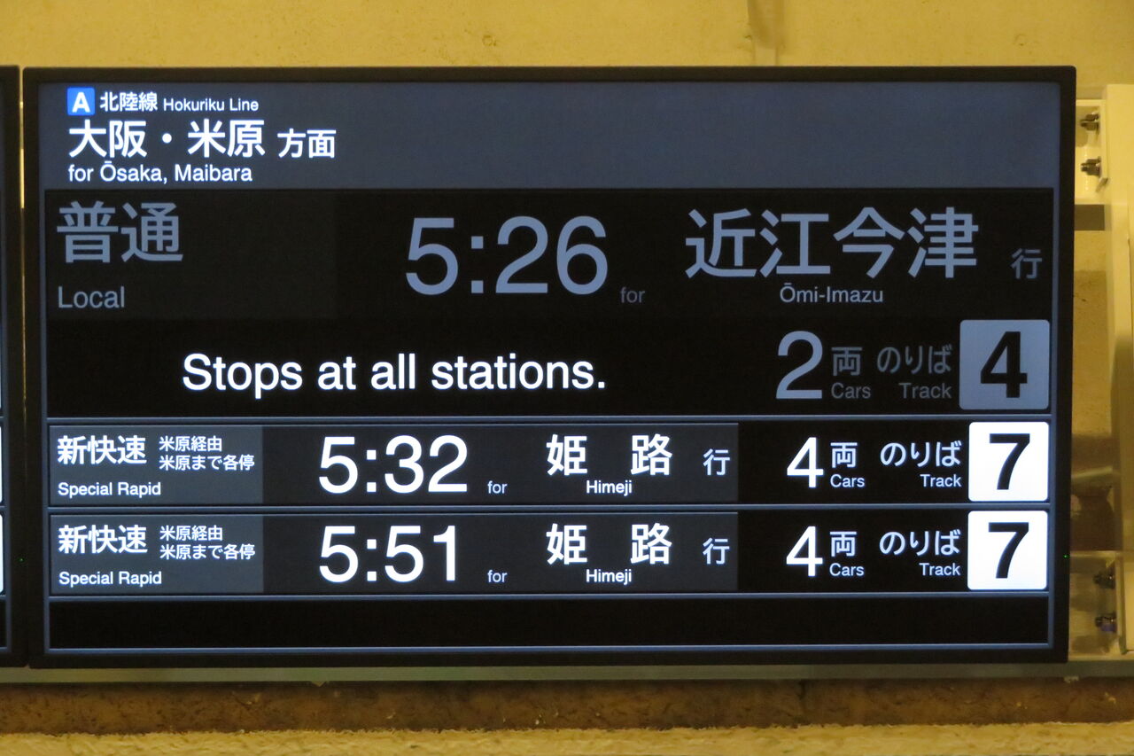 5時26分発の普通 近江今津行きは、2024年1月現在、4番のりばから発車する唯一の列車です。