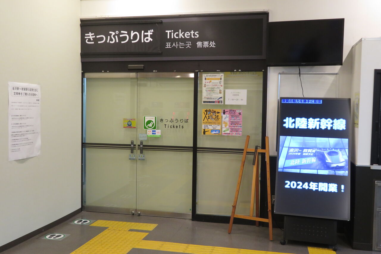 この駅は、2024年3月16日に北陸新幹線のホーム・駅舎が開業するのですが、3色LED発車標の横幅が広く、改札口に新幹線の発車標を設置するスペースがなかったんですよね。