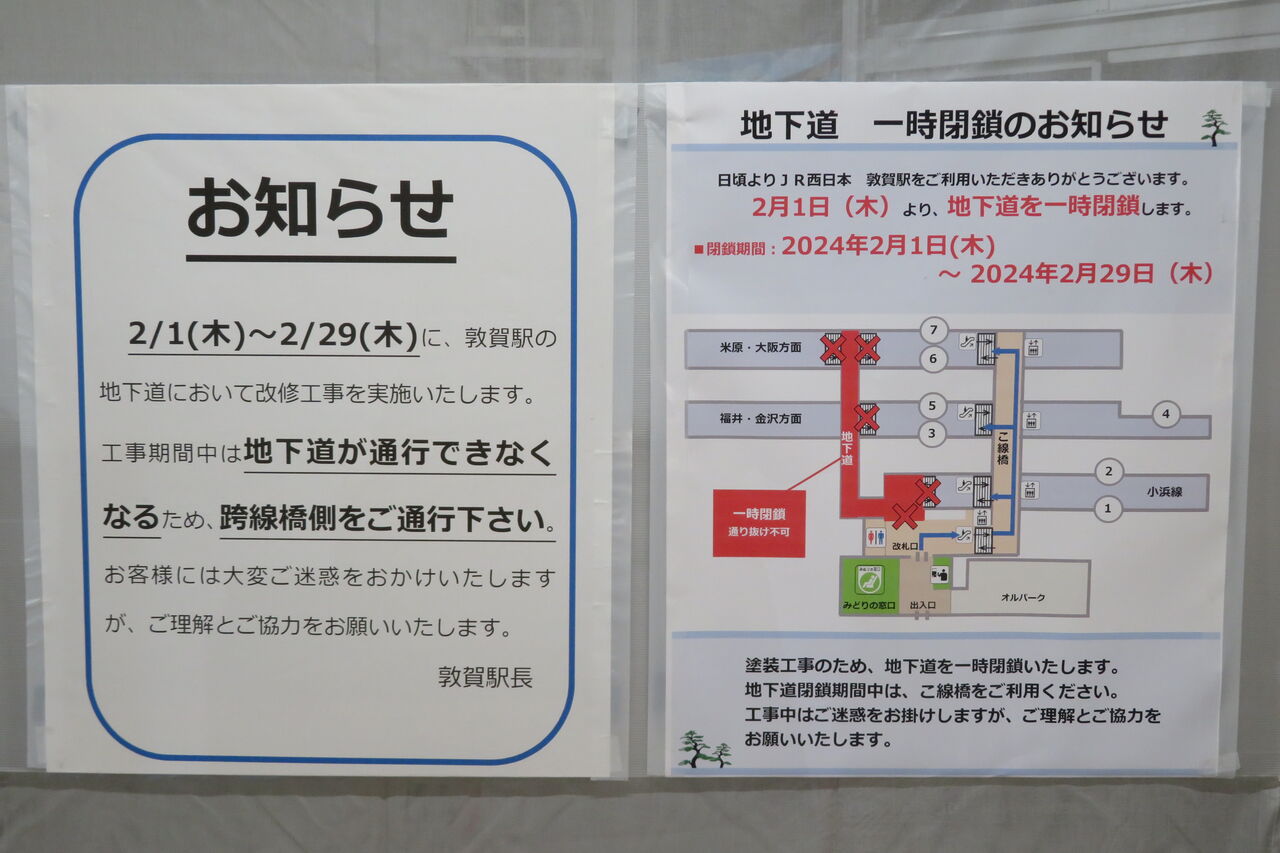 2024年2月に敦賀駅を訪れると、改札内の地下道が 改修工事のため 一時的に閉鎖されていました。