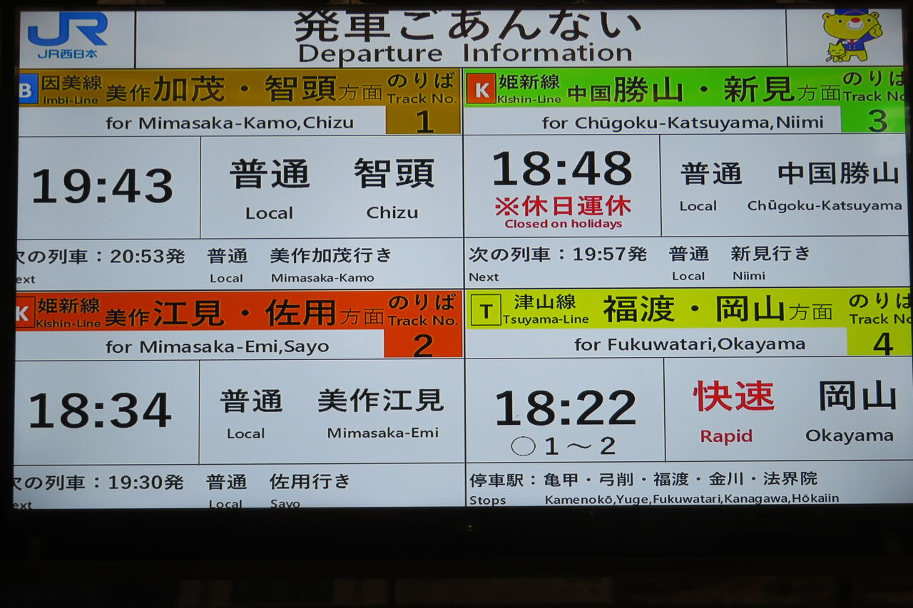 姫新線上りの発車案内には、1日に2本しかない普通 「美作江見行き」 が表示されています。