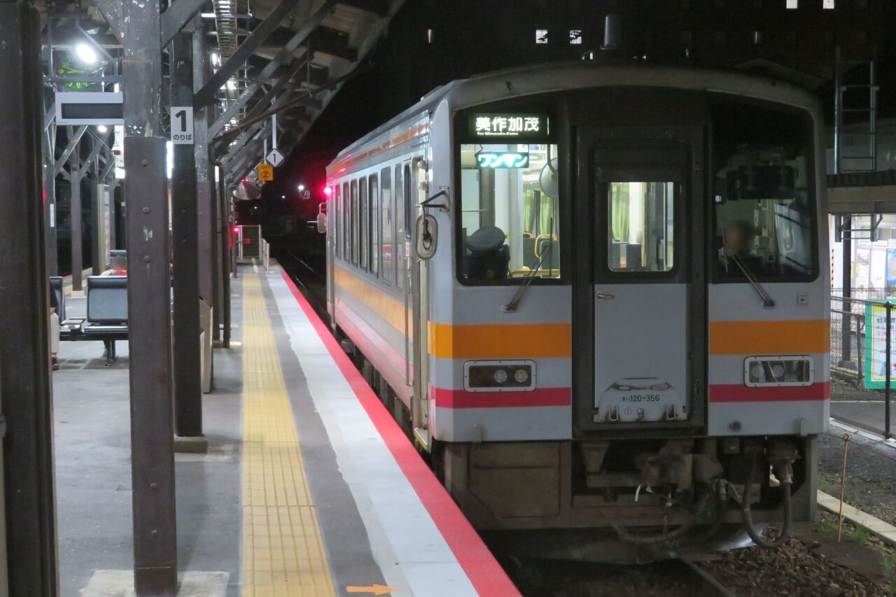 続いて、1番のりばに停車中の普通 美作加茂行きを撮影。