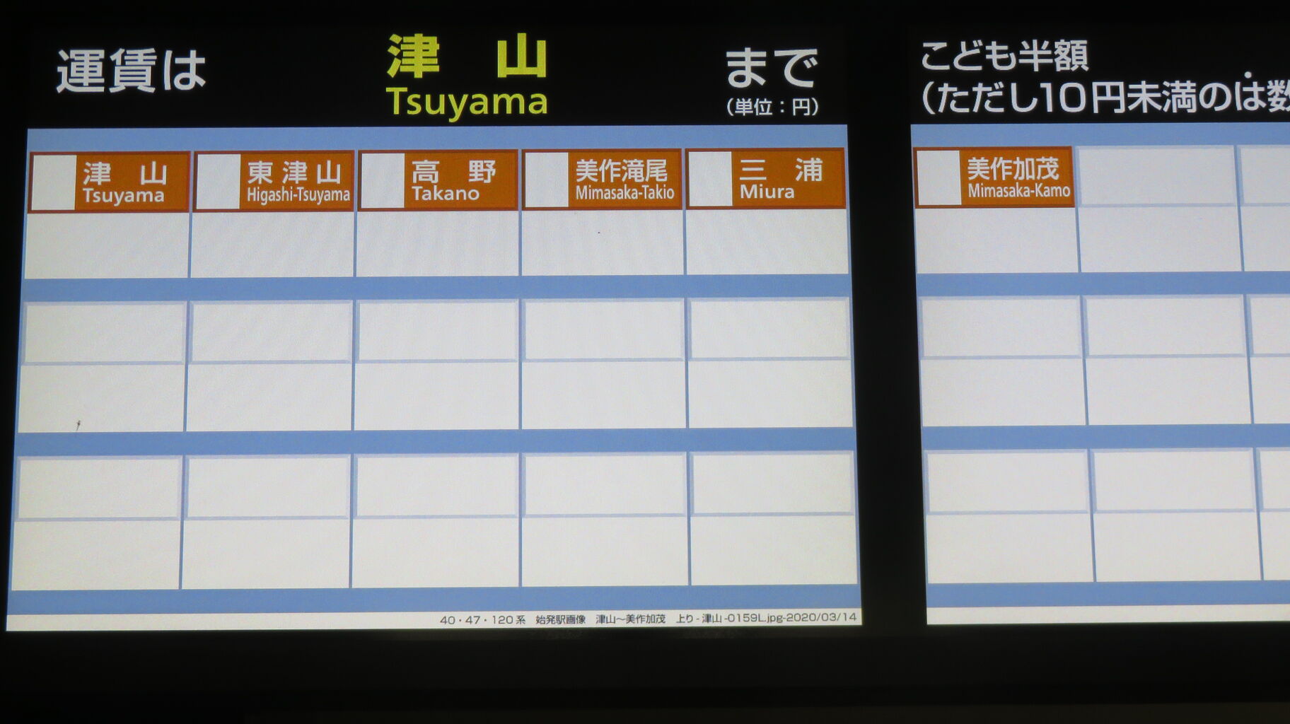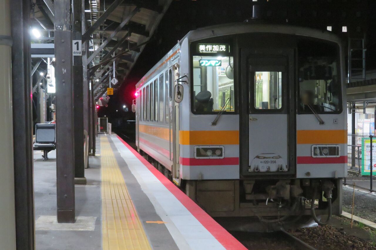 1本目はは5時33分発の快速 美作加茂行き(休日運休)、2本目は20時53分発の普通 美作加茂行き(毎日運転)です。