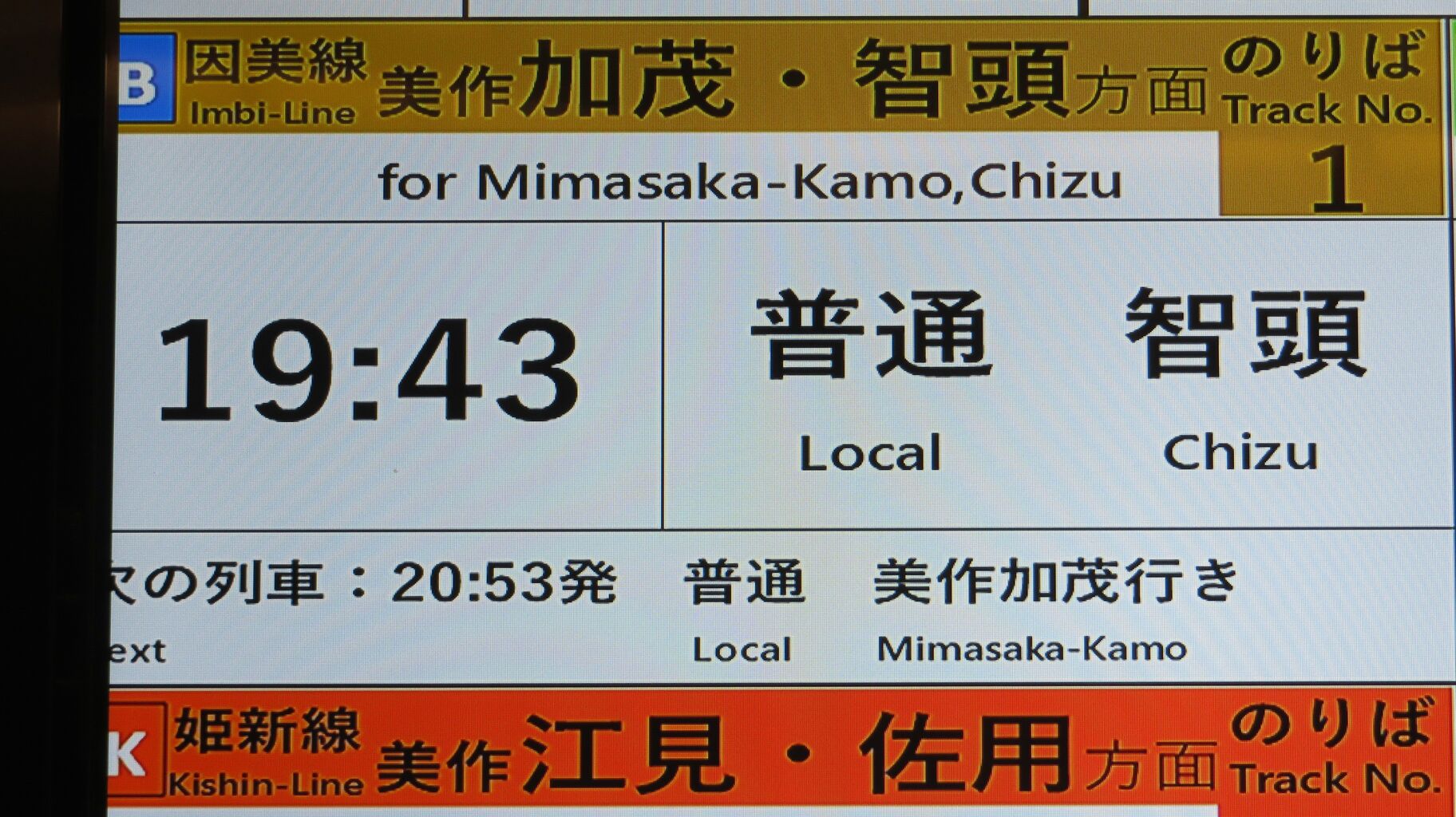 19時43分発の普通 智頭行きが発車した後、先発の普通 美作加茂行きが大きく表示されました。