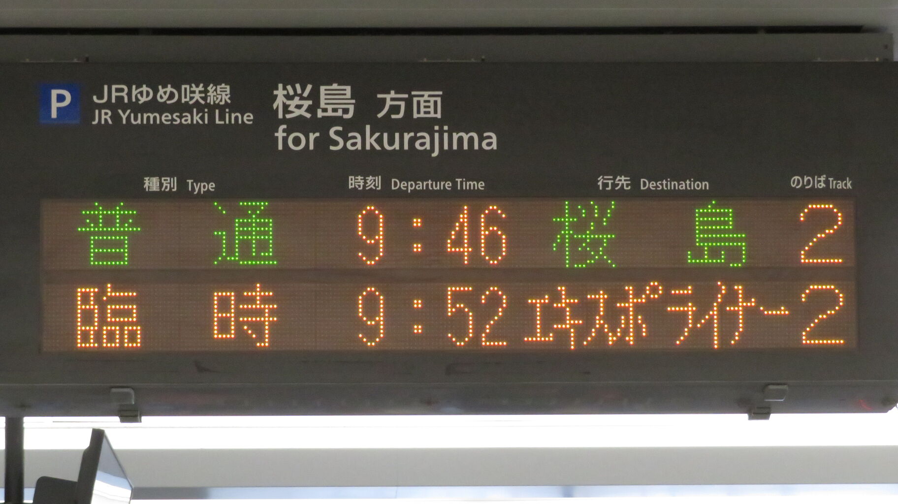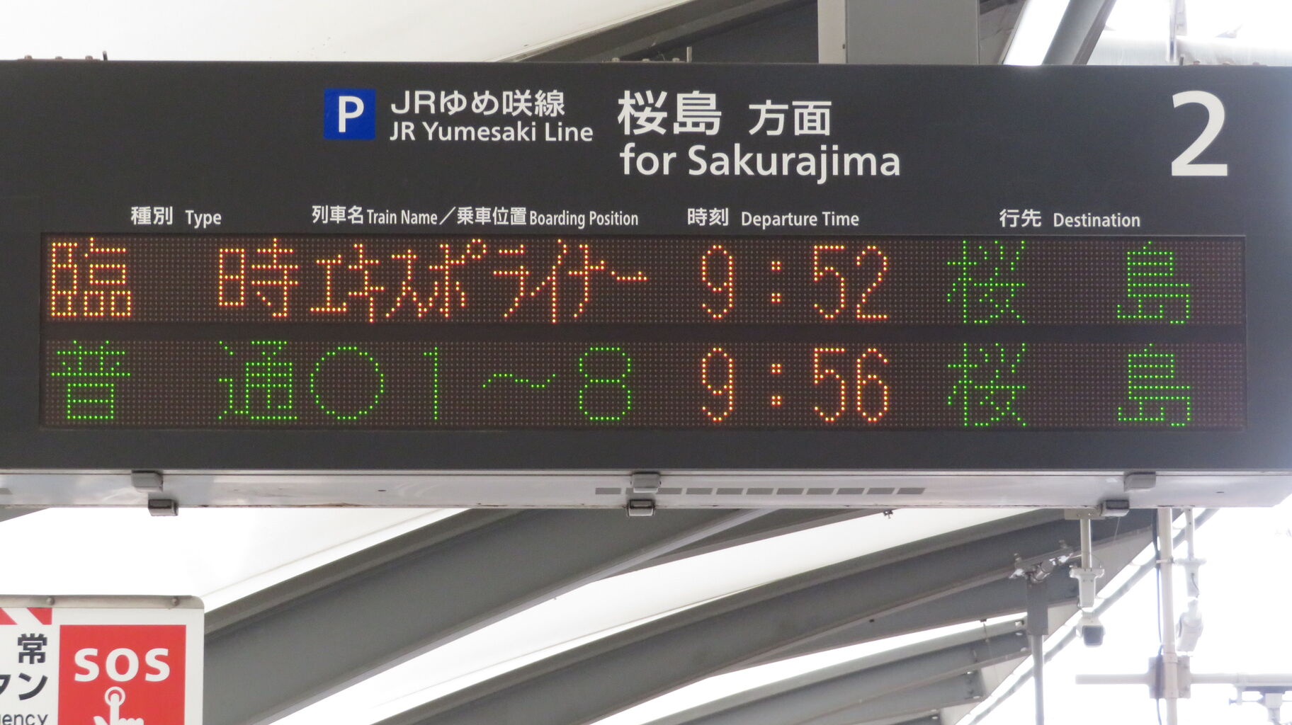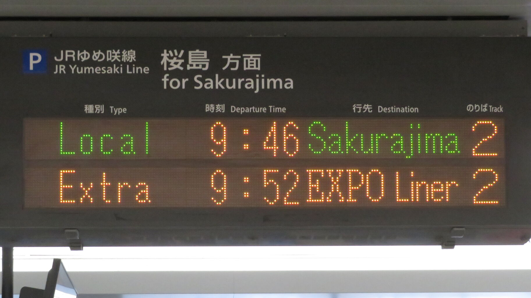 下の段に、臨時列車 「エキスポライナー」 桜島行きの表示が出ました。