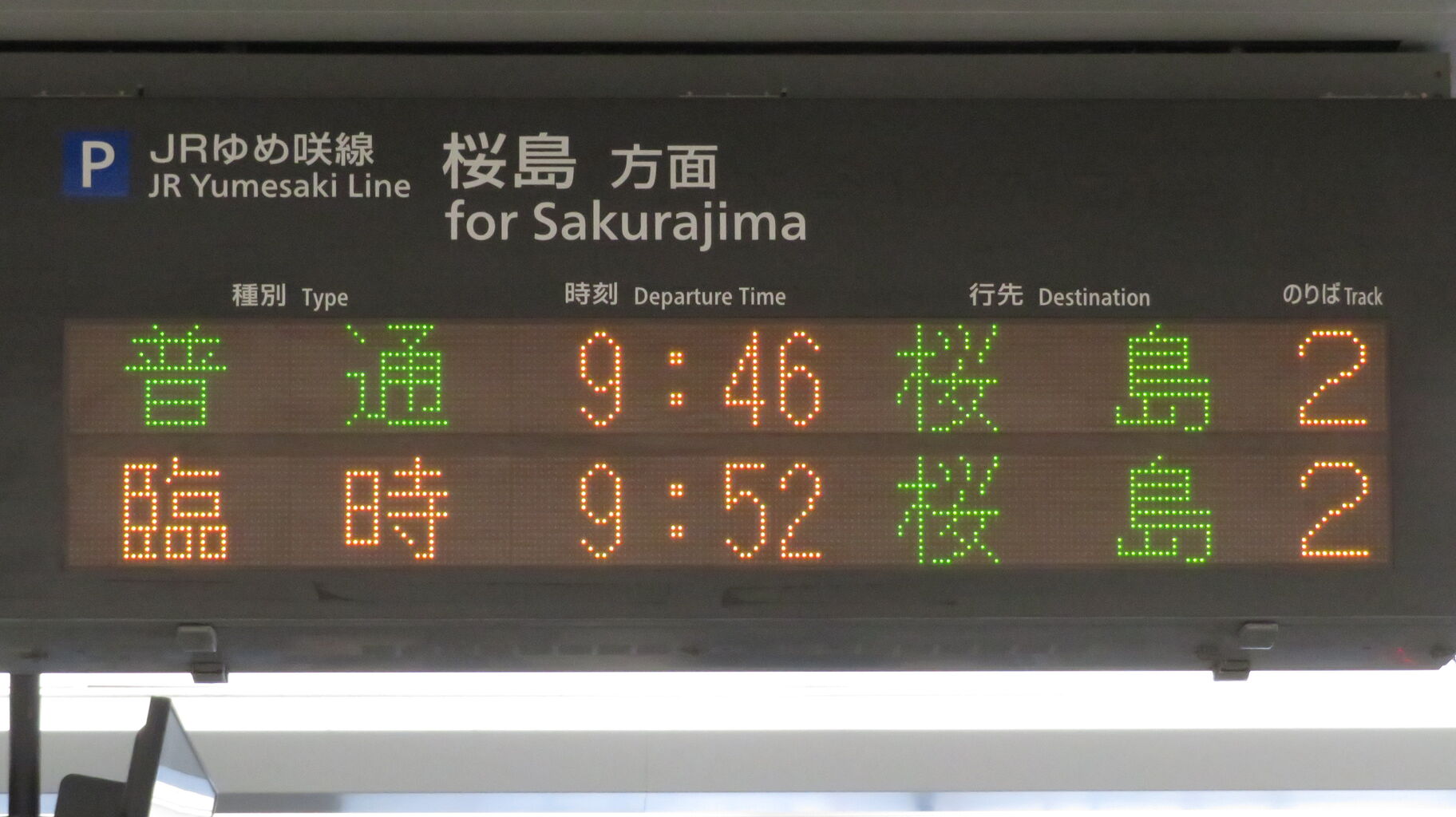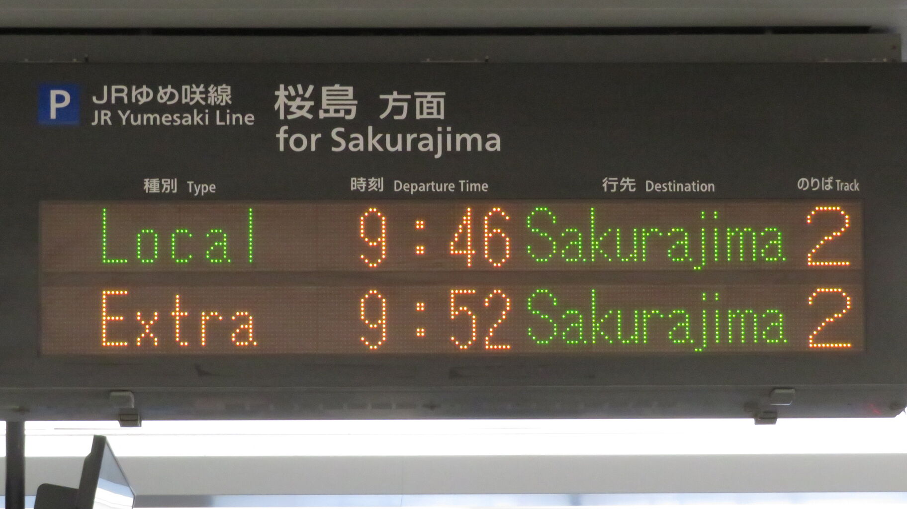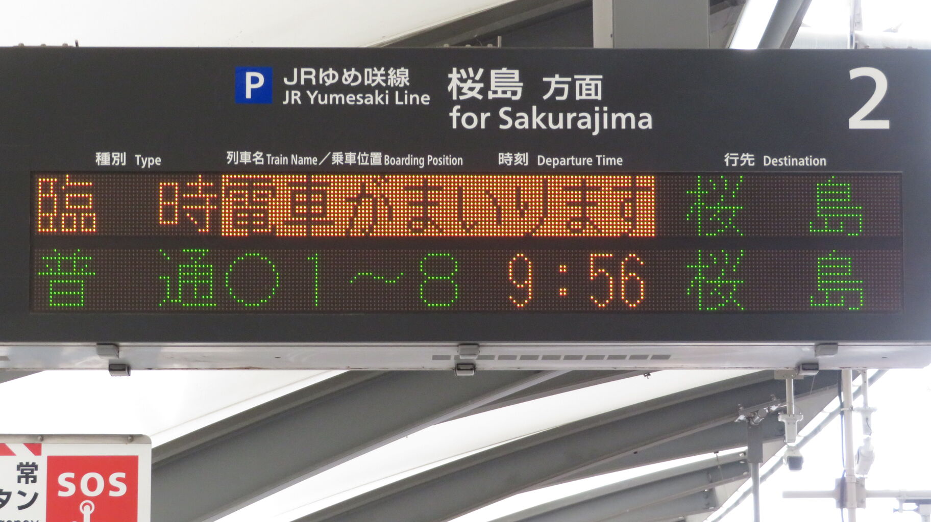 下の段に、臨時列車 「エキスポライナー」 桜島行きの表示が出ました。