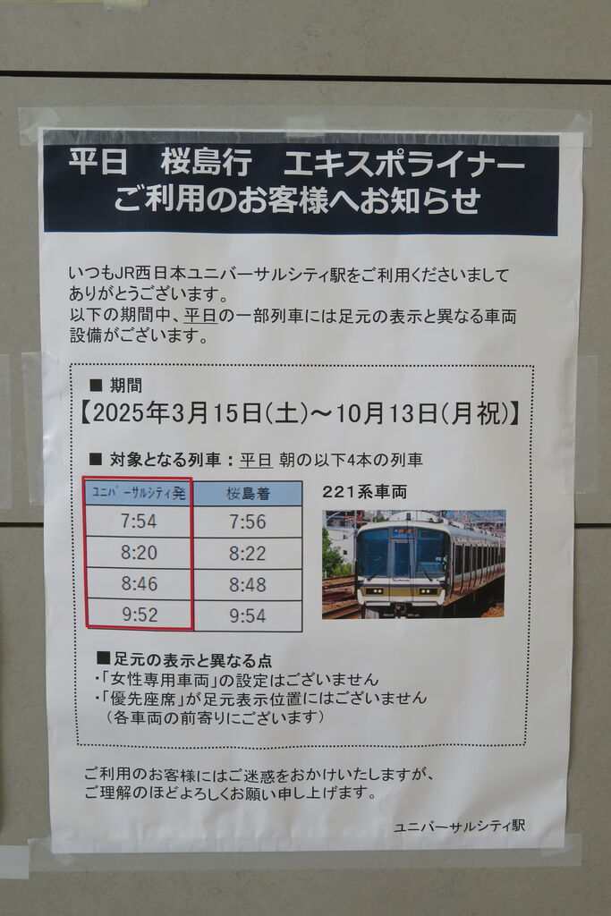 今回は、2025年5月にユニバーサルシティ駅で撮影した 221系のエキスポライナーをご紹介。
