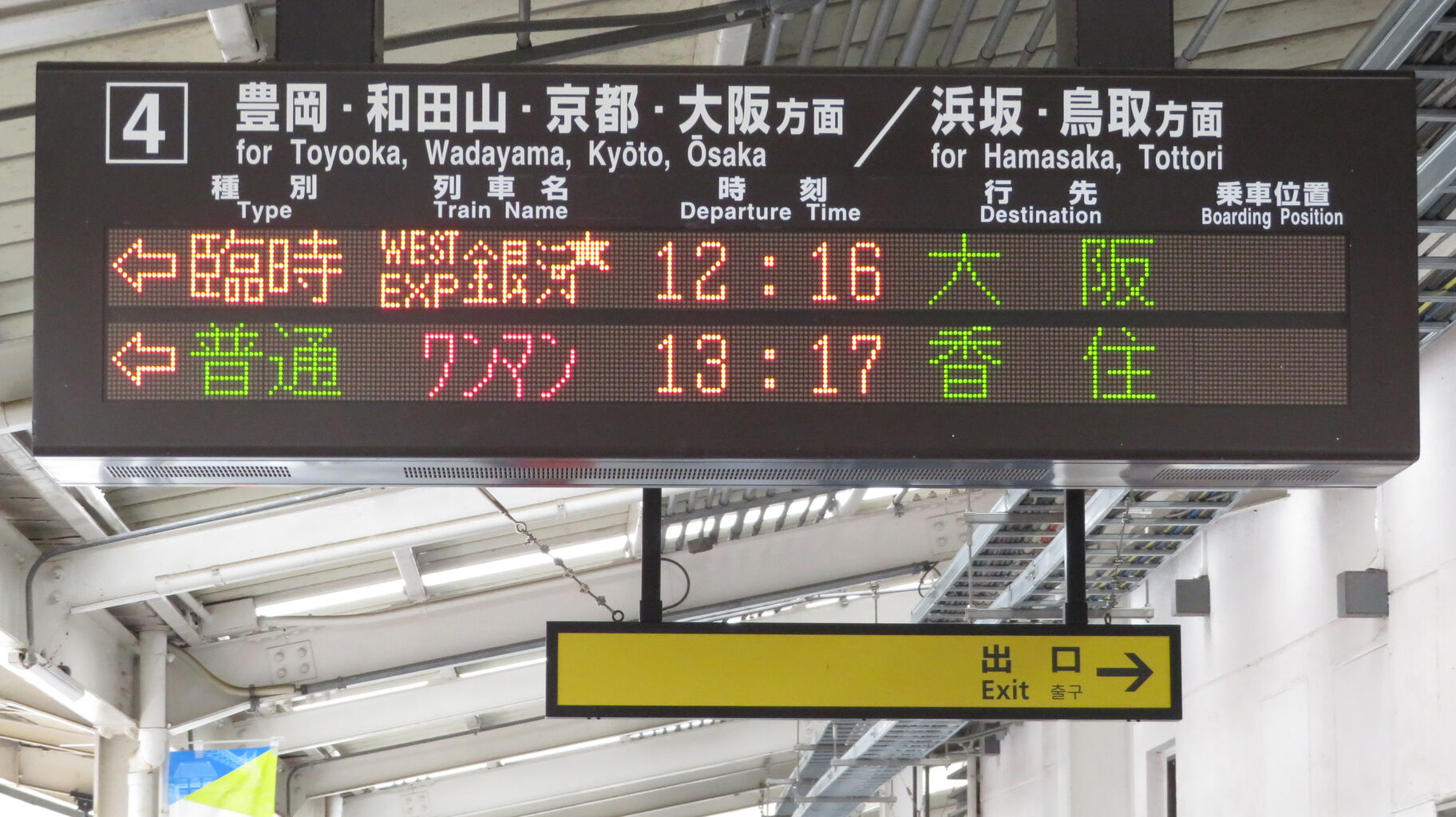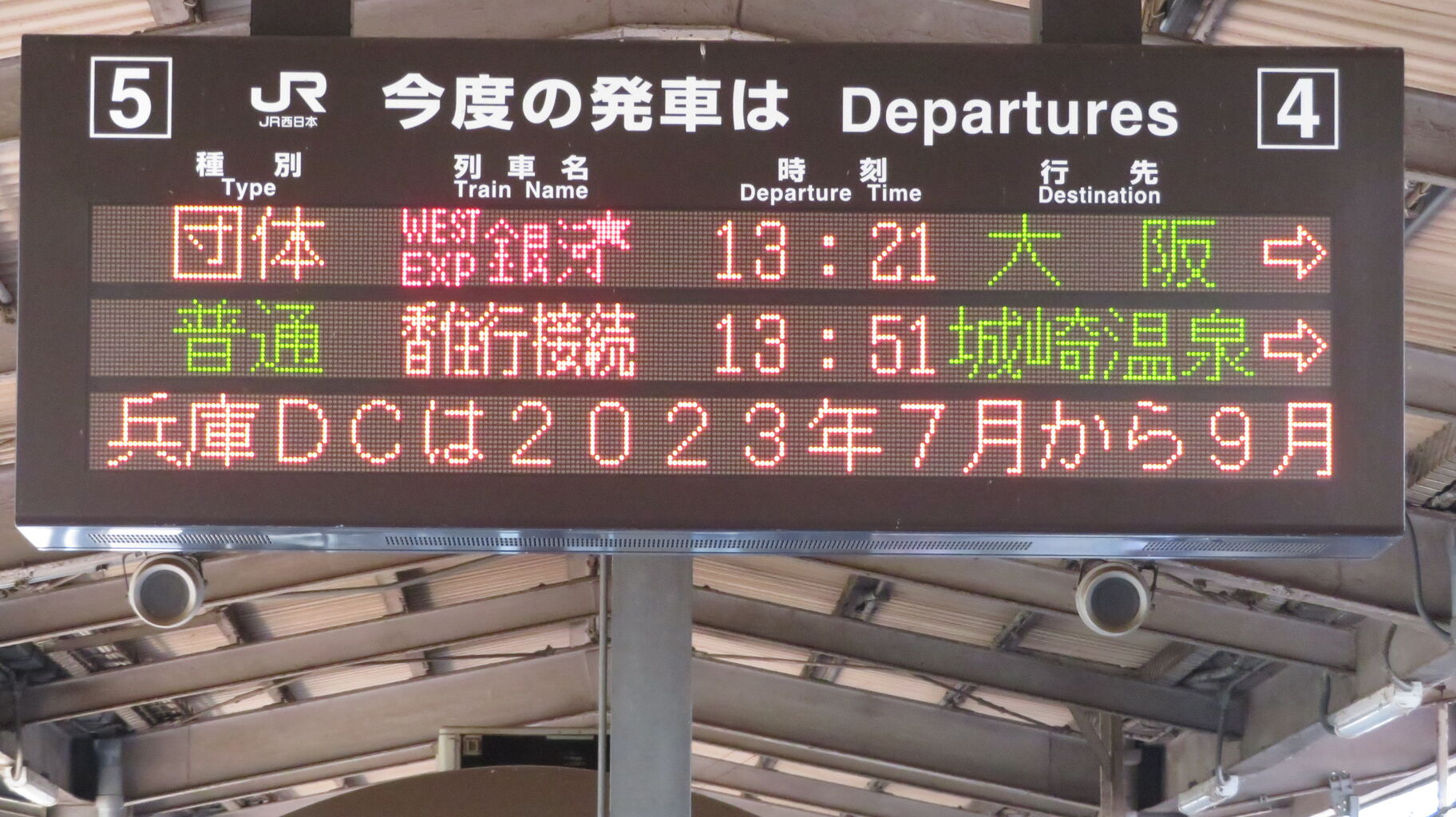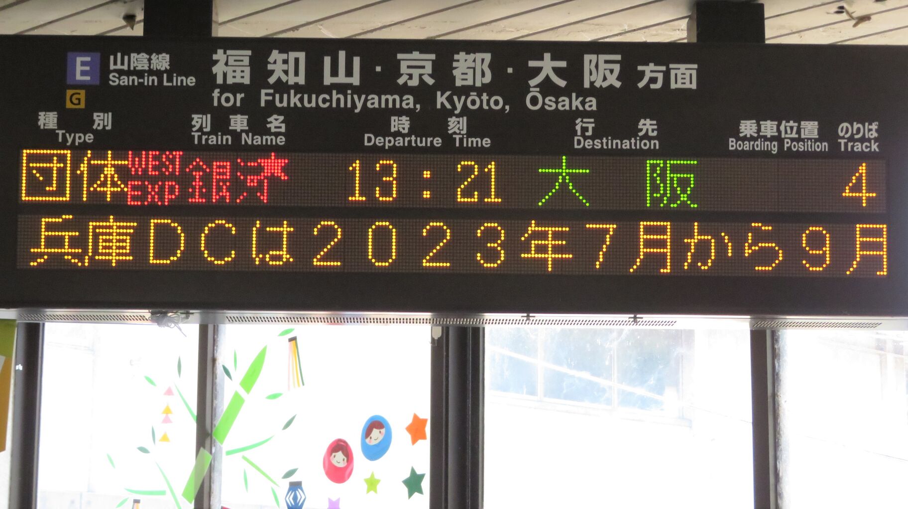 英語表示の時、城崎温泉駅では 列車名欄に 「Ginga」 と表示されましたが、和田山駅では 日本語の 「WEST EXP 銀河」 のまま変わりませんでした。