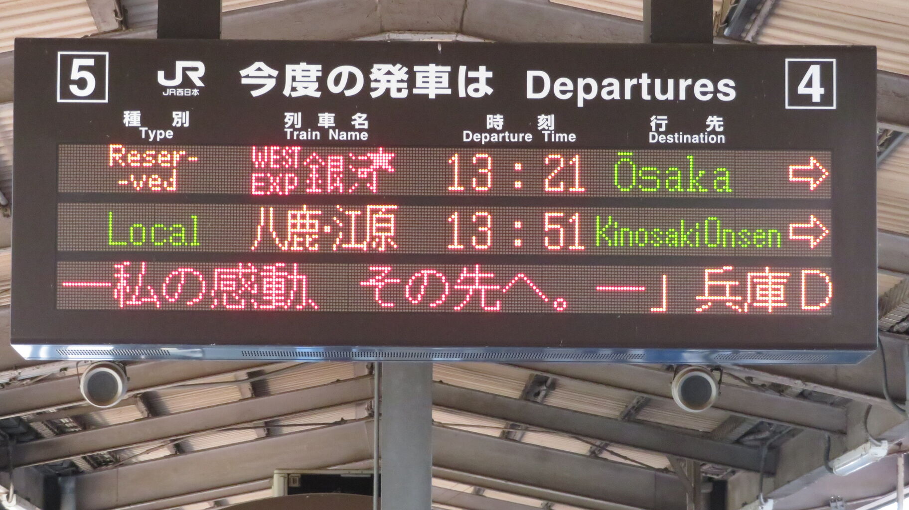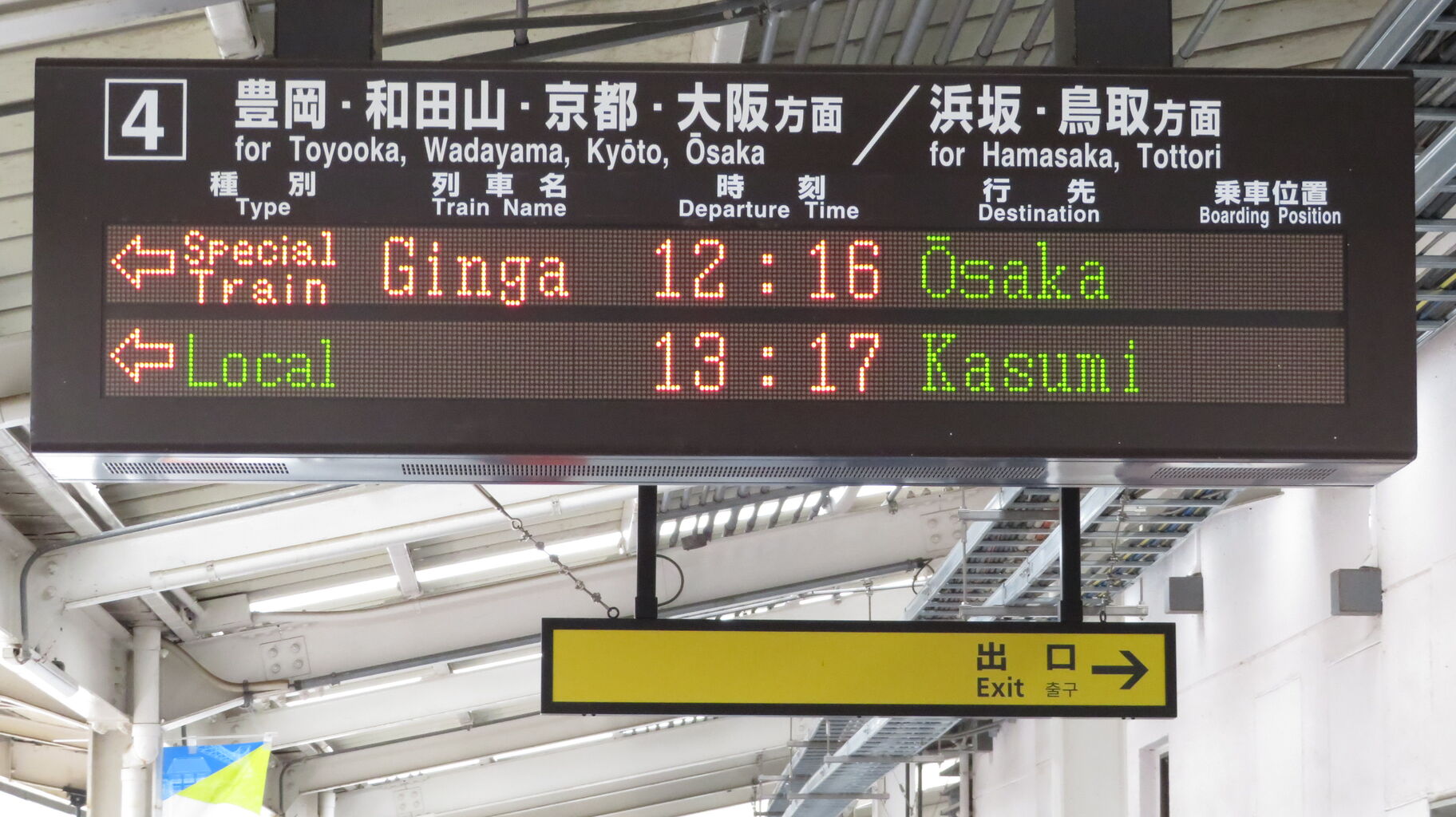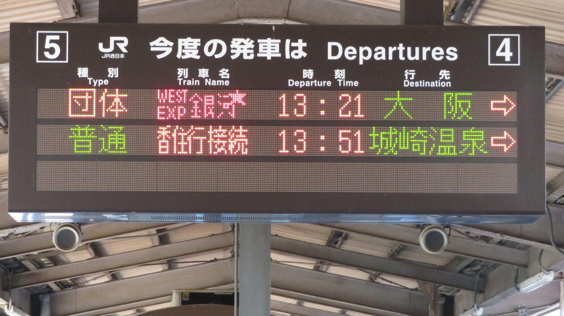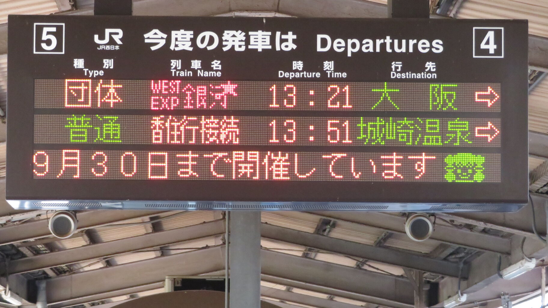 城崎温泉駅の場合、列車名欄に 「WEST EXP 銀河」 「Ginga」 と表示されていました。