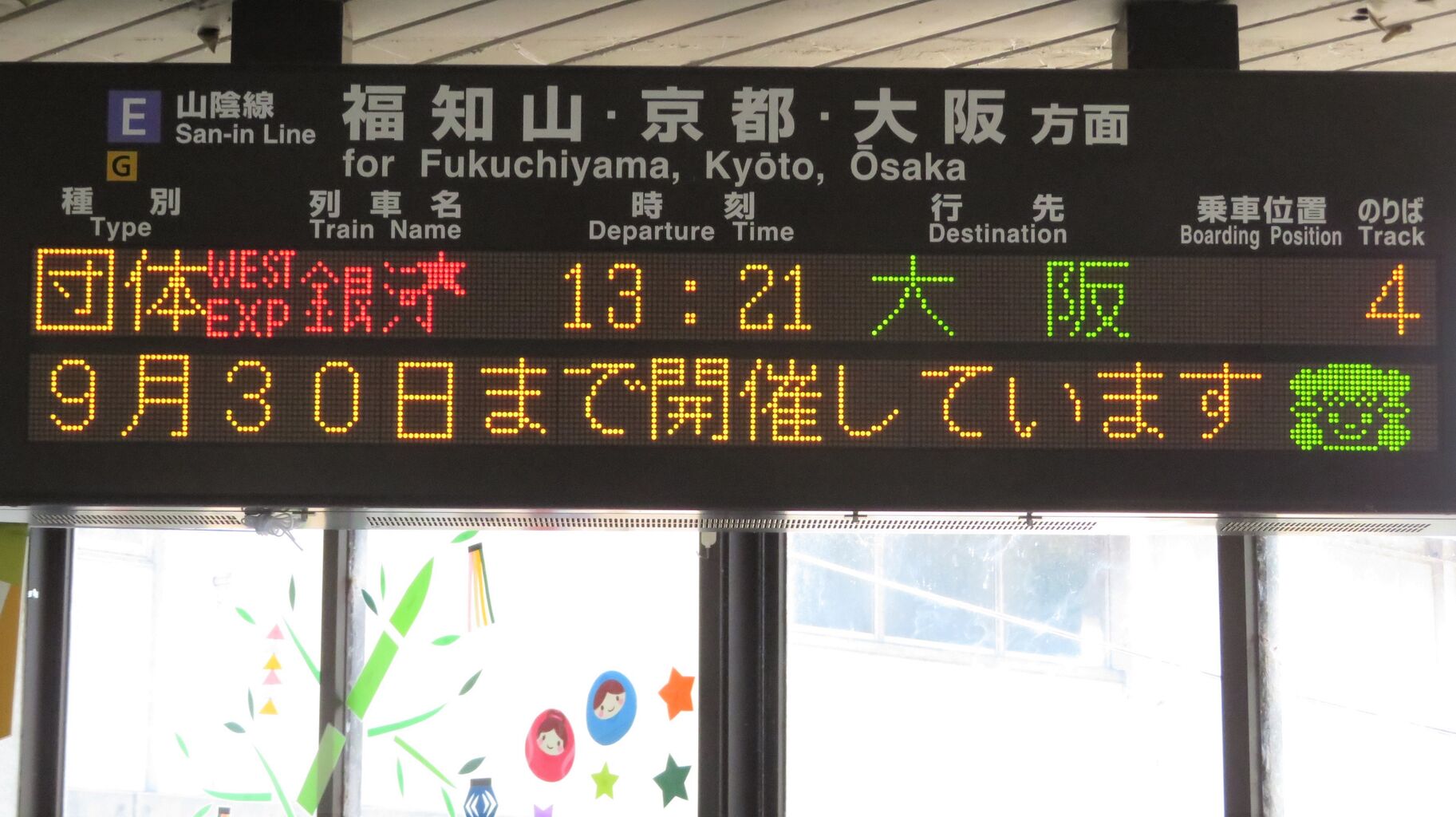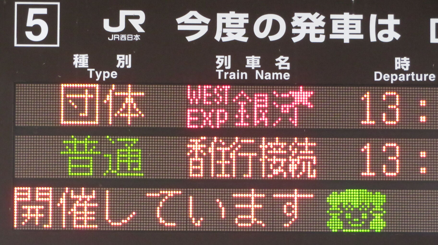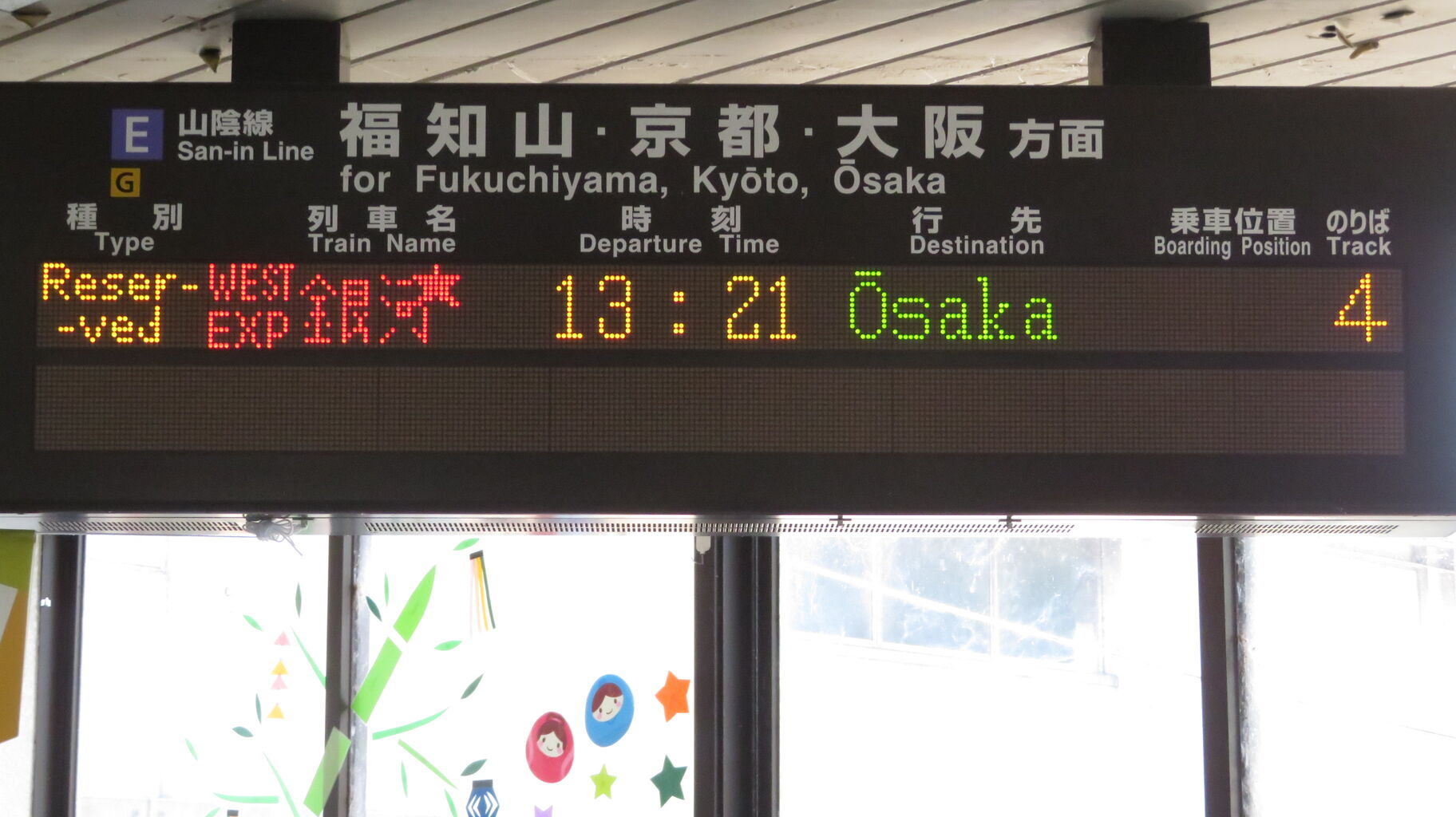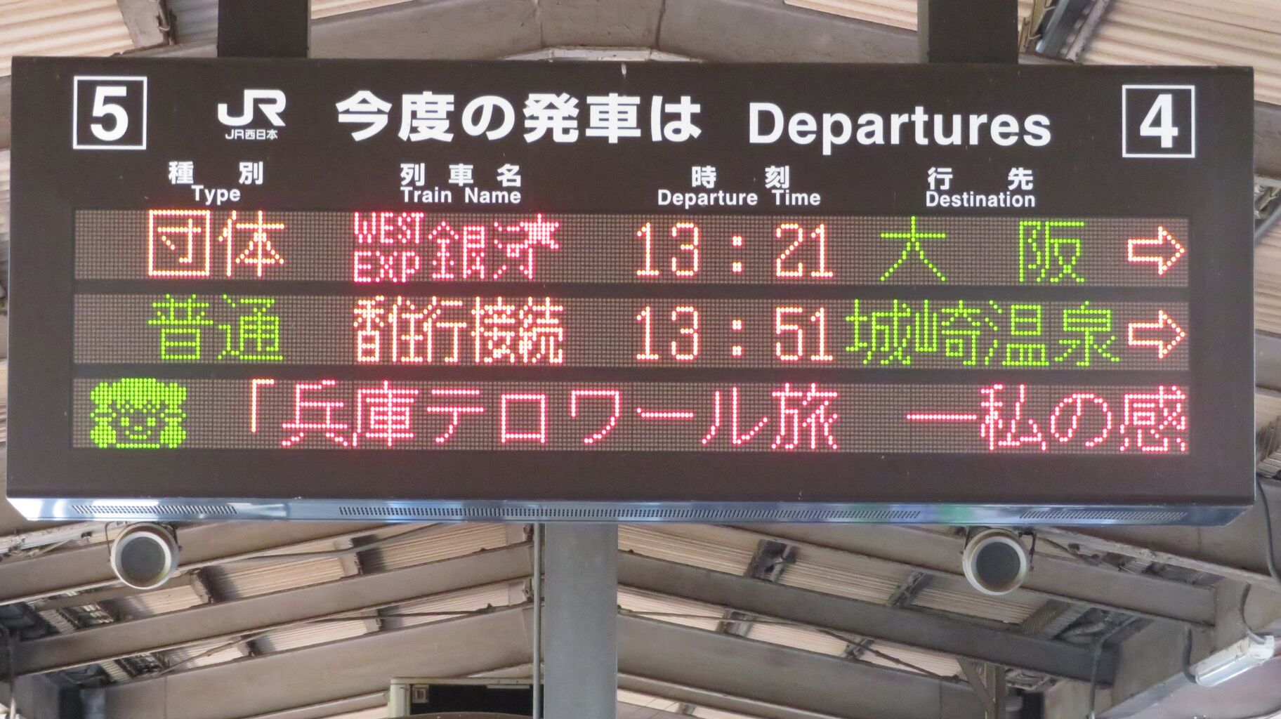 城崎温泉駅の場合、列車名欄に 「WEST EXP 銀河」 「Ginga」 と表示されていました。