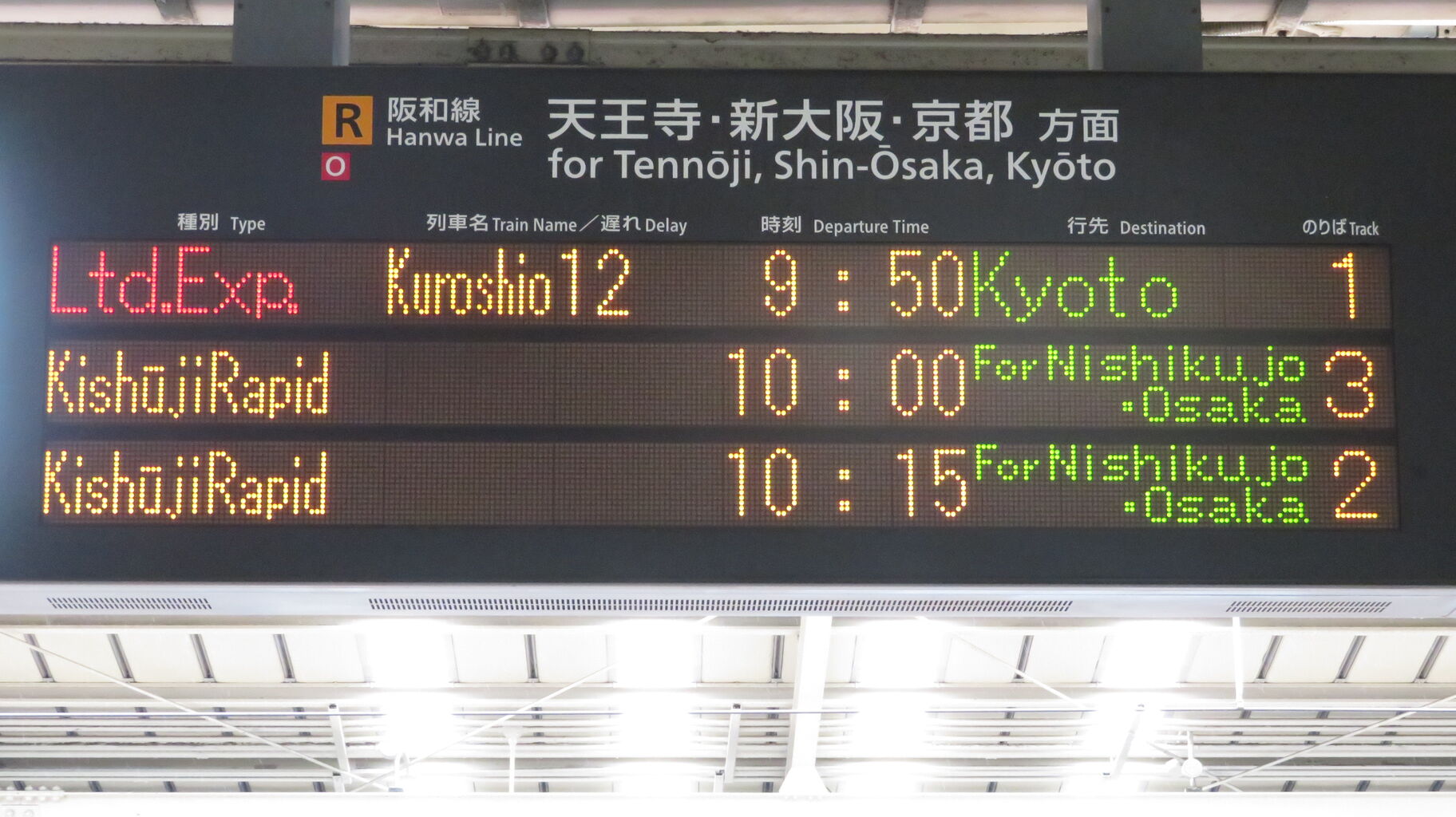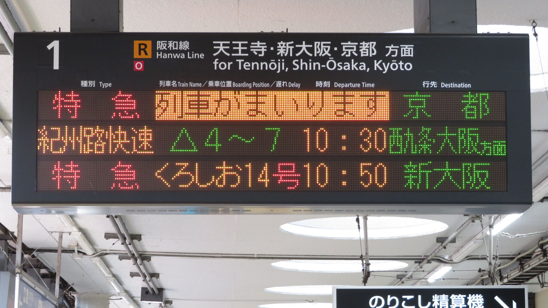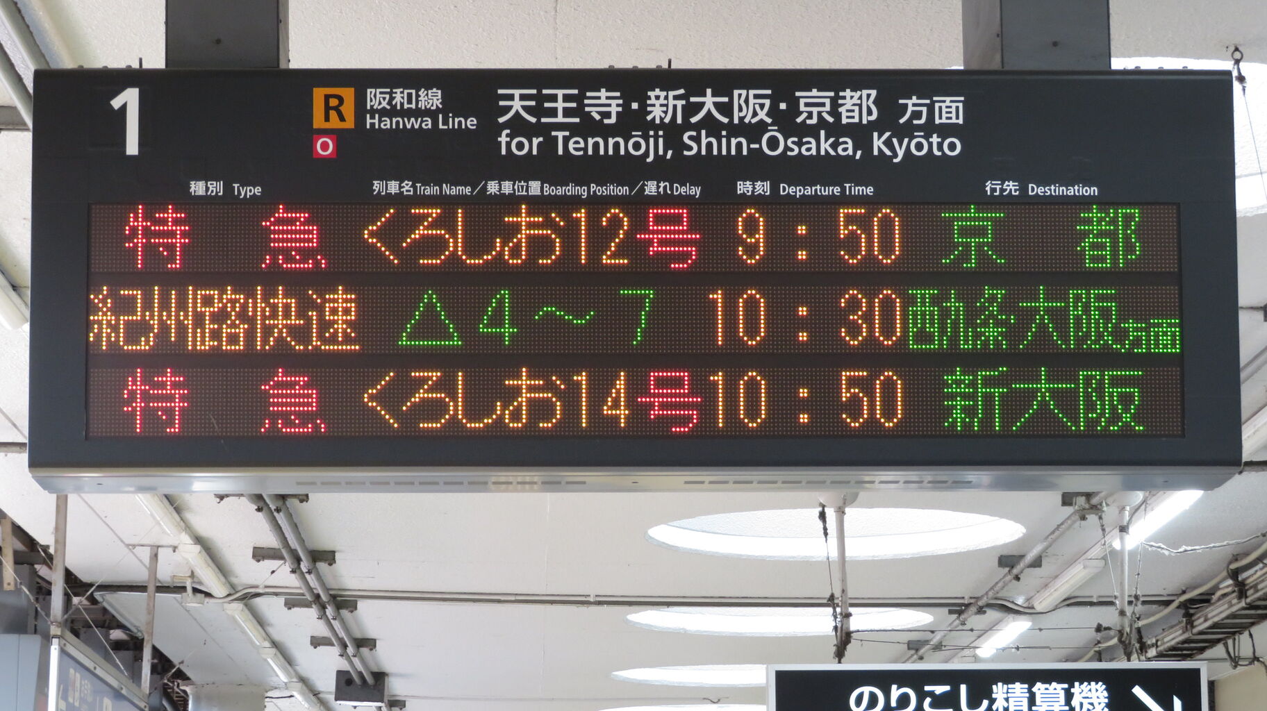 一番上の段に、特急くろしお 京都行きの表示が出ています。