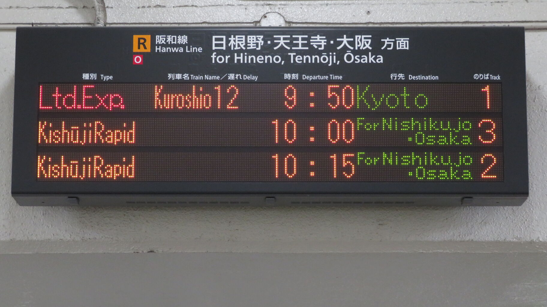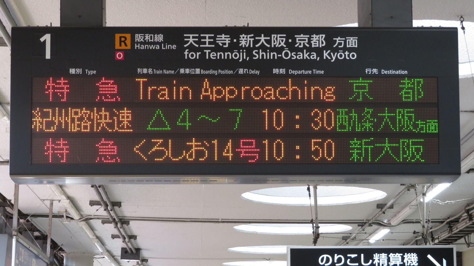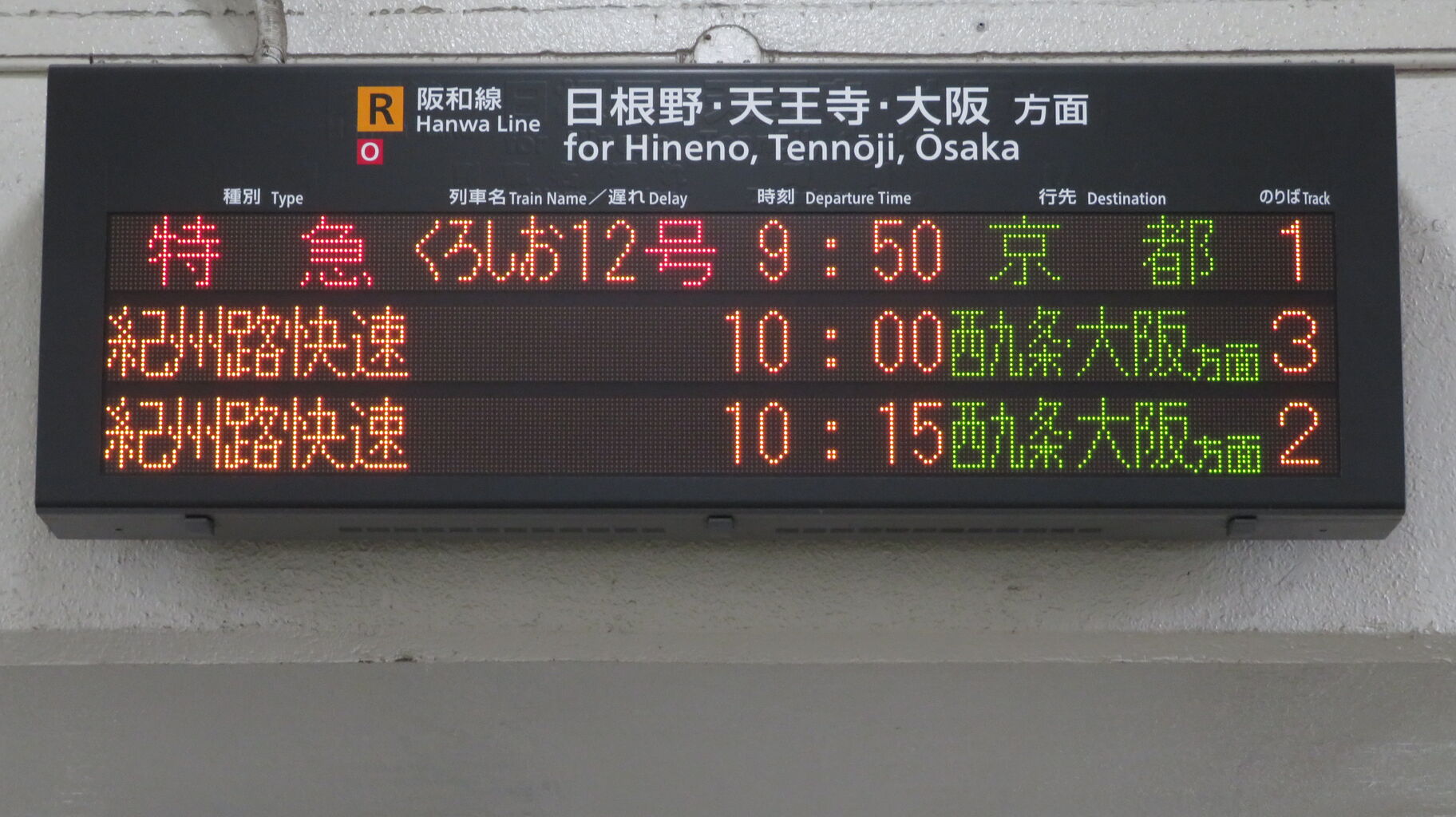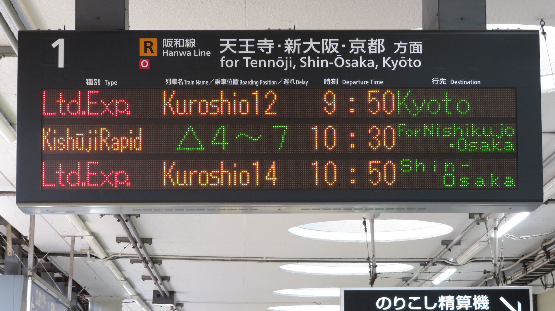 一番上の段に、特急くろしお 京都行きの表示が出ています。