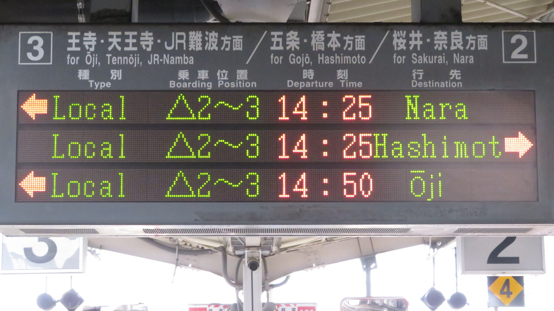 王寺駅の発車標と異なり、「五条方面 橋本」 と表示されていました。