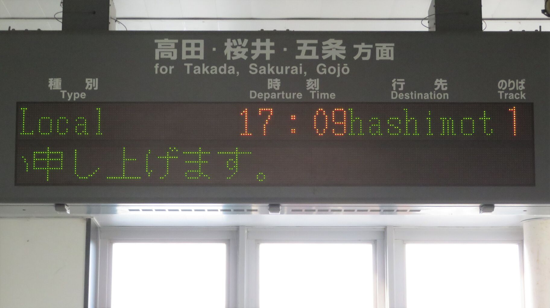 発車後に 発車標を撮ろうとしましたが、下の段にスクロール表示が流れ続けていたため 橋本行きの表示を撮ることができず、次の高田行きに乗って 高田駅へ向かいました。